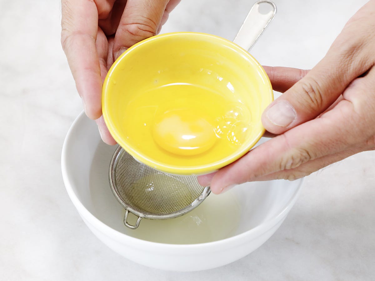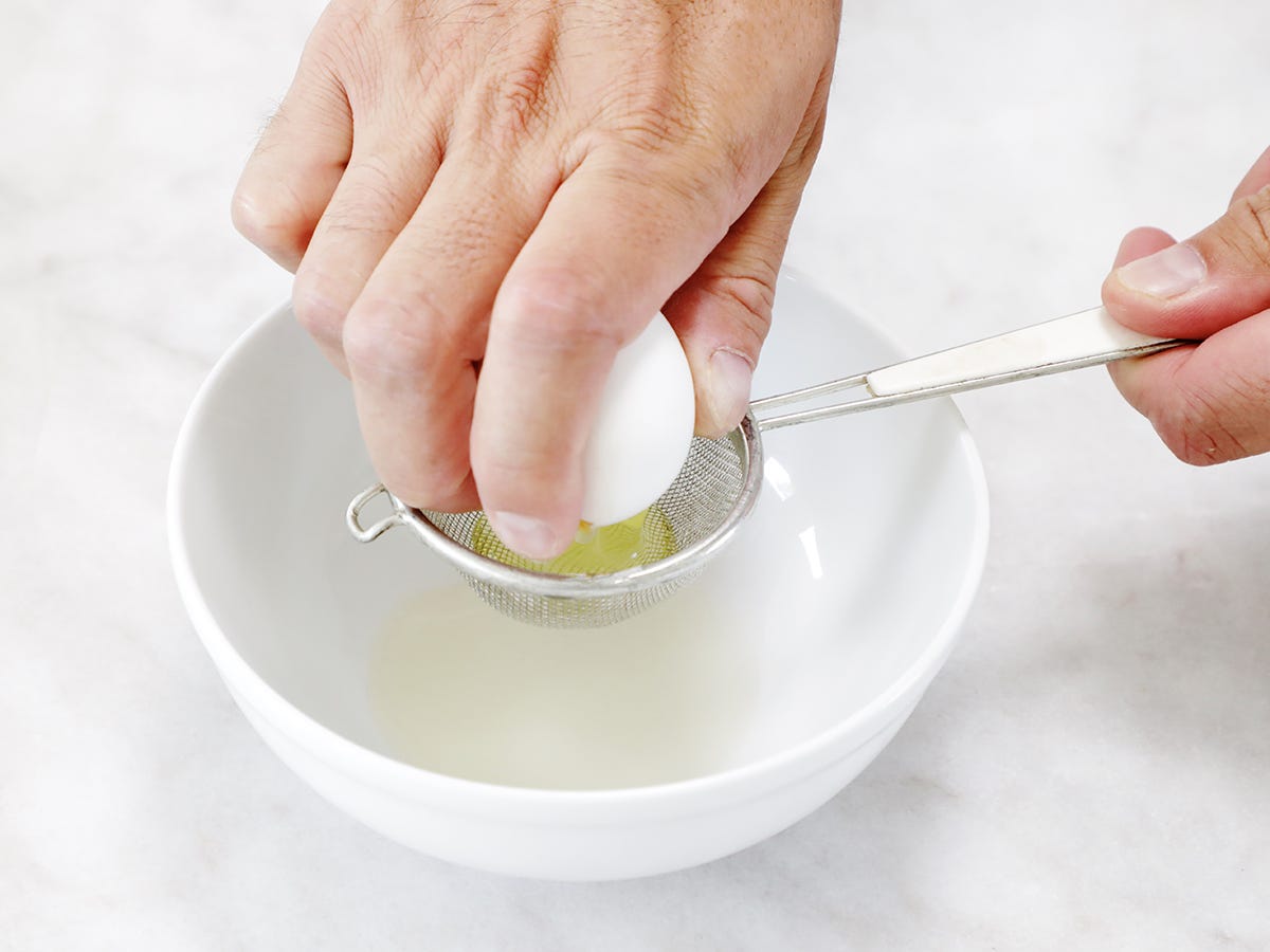 You’ll poach the eggs one by one, using two eggs per slice of toast. First, remove the excess liquid from the egg by cracking it into a small strainer over a bowl.