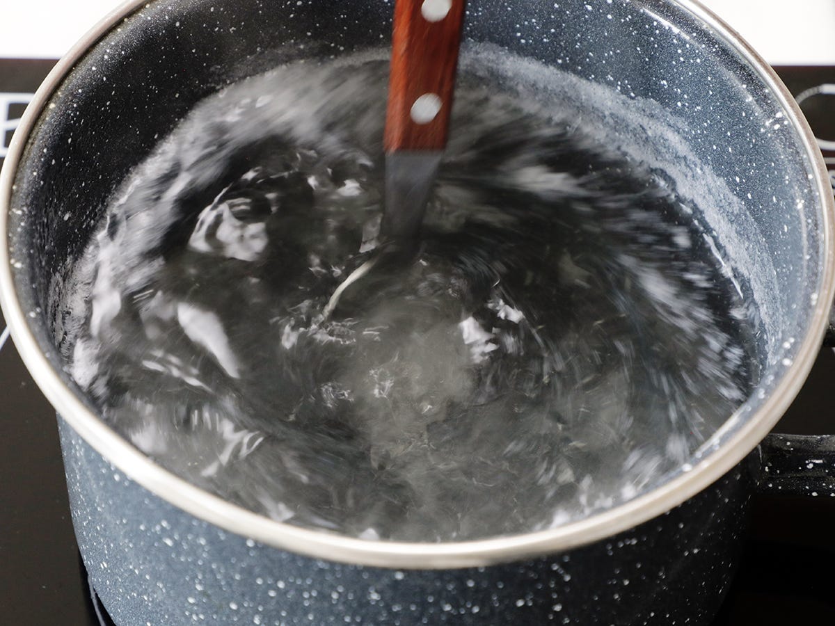 Bring the water to a low simmer. Don’t let the water boil. If it’s boiling, lower the heat before adding the egg. With a spoon, stir the water on the stove until you create a whirlpool.