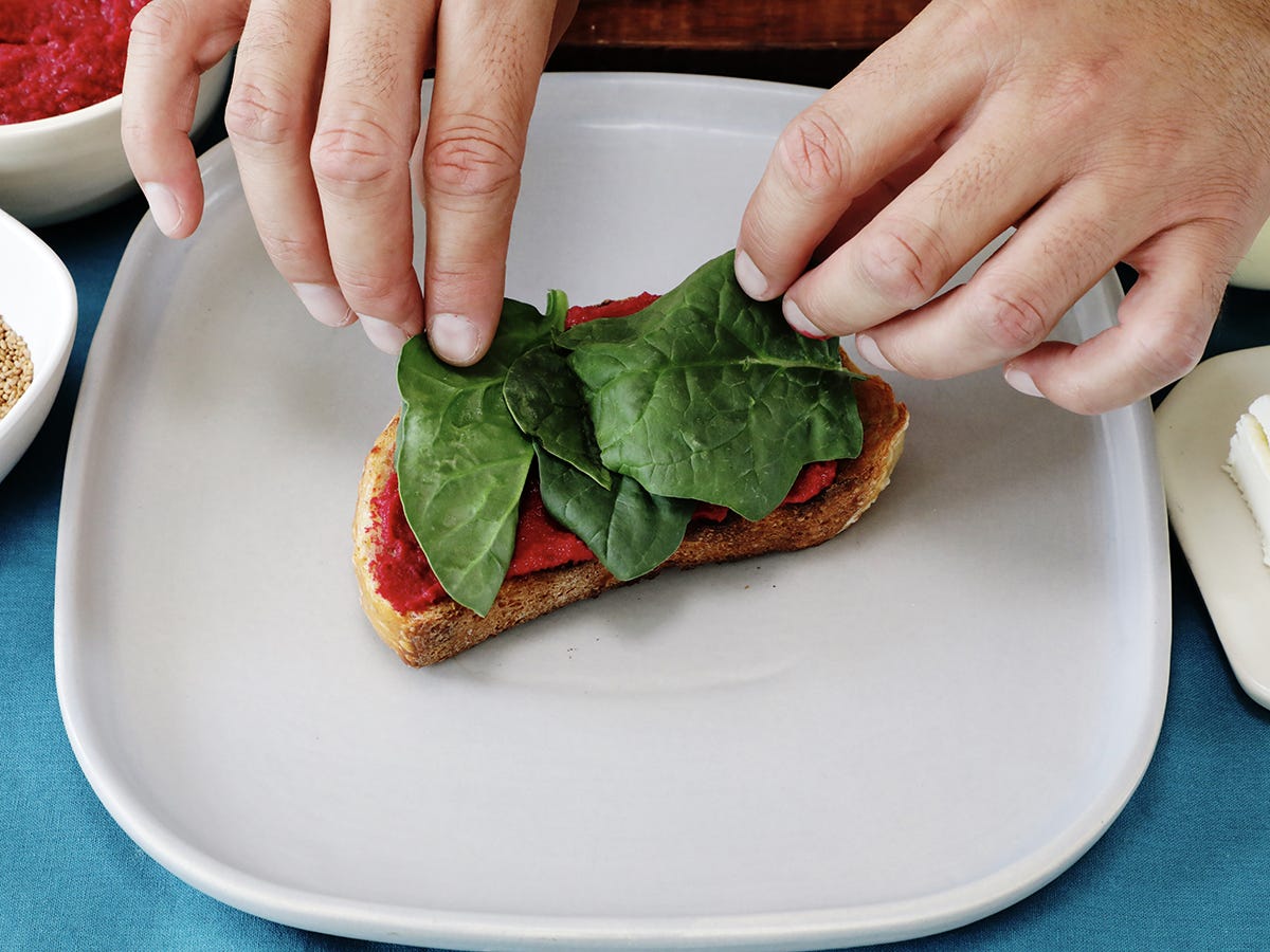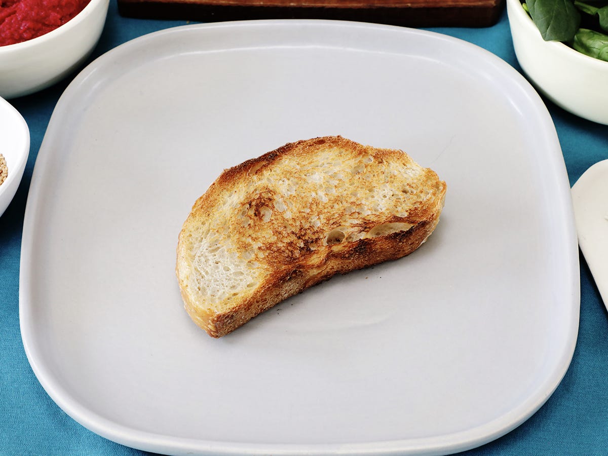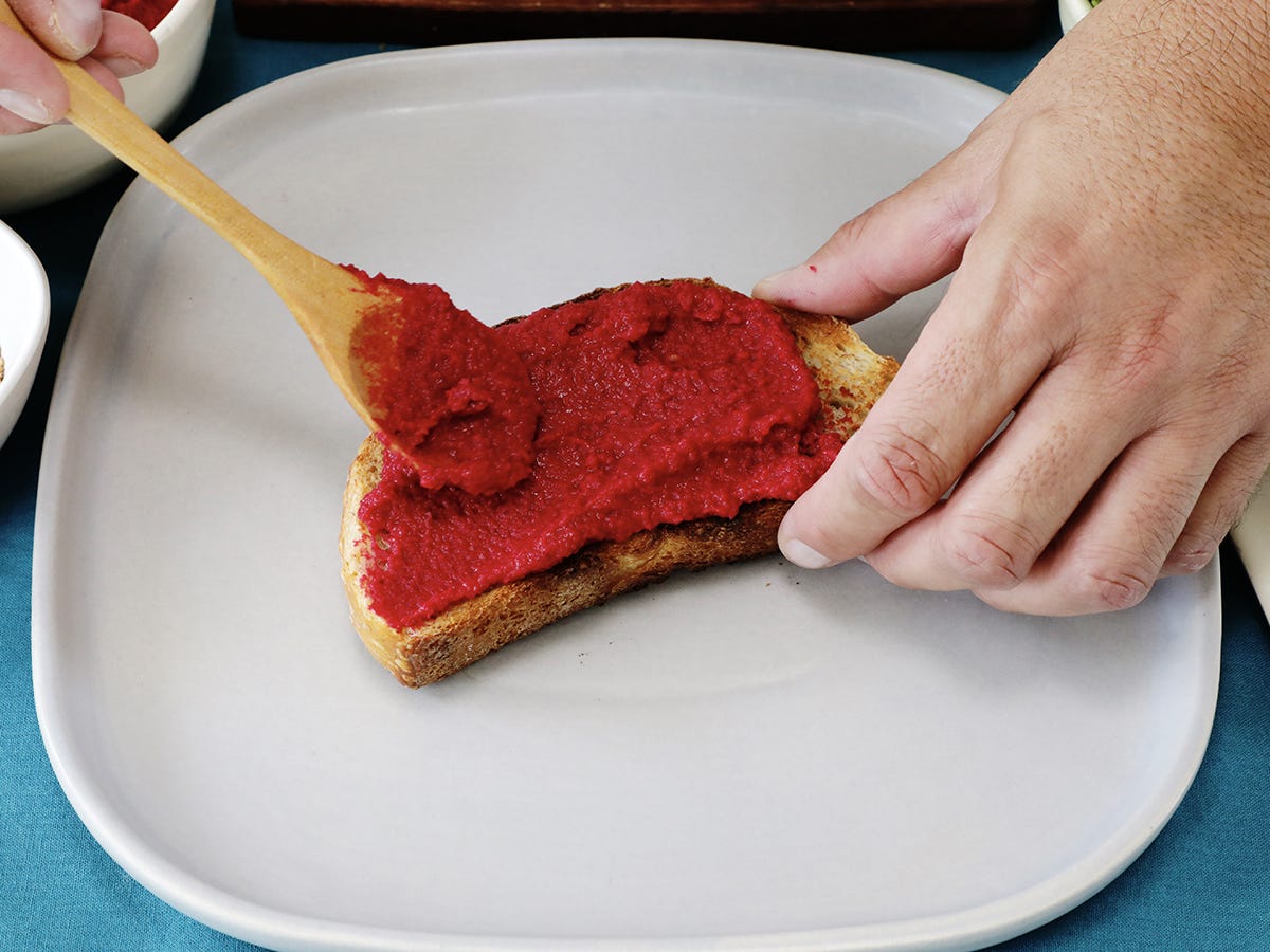 Spread the beet hummus on the toast using a small spoon or spatula.