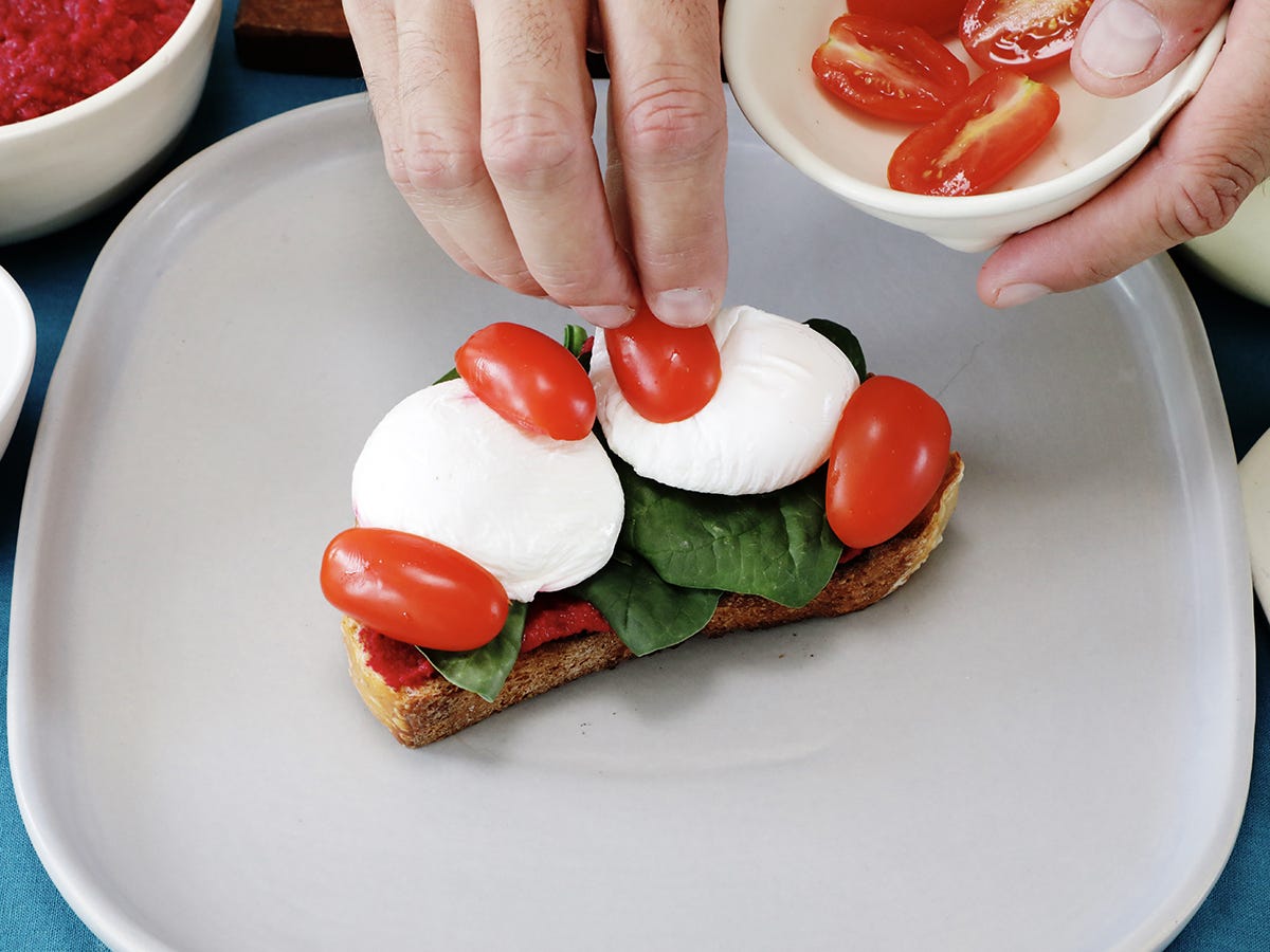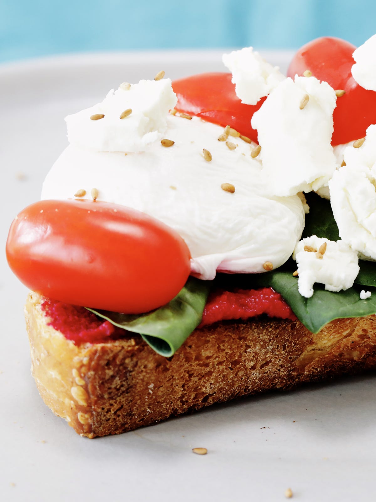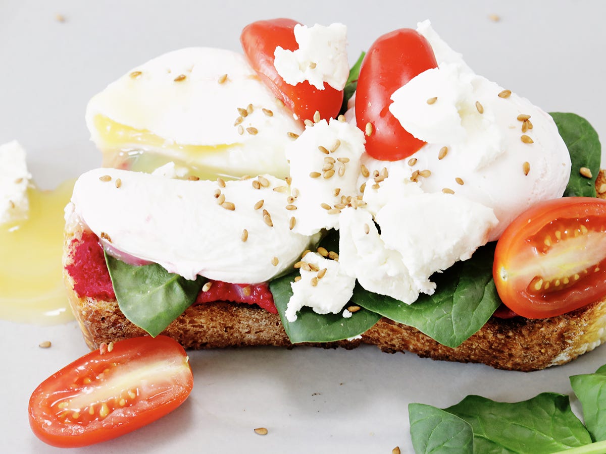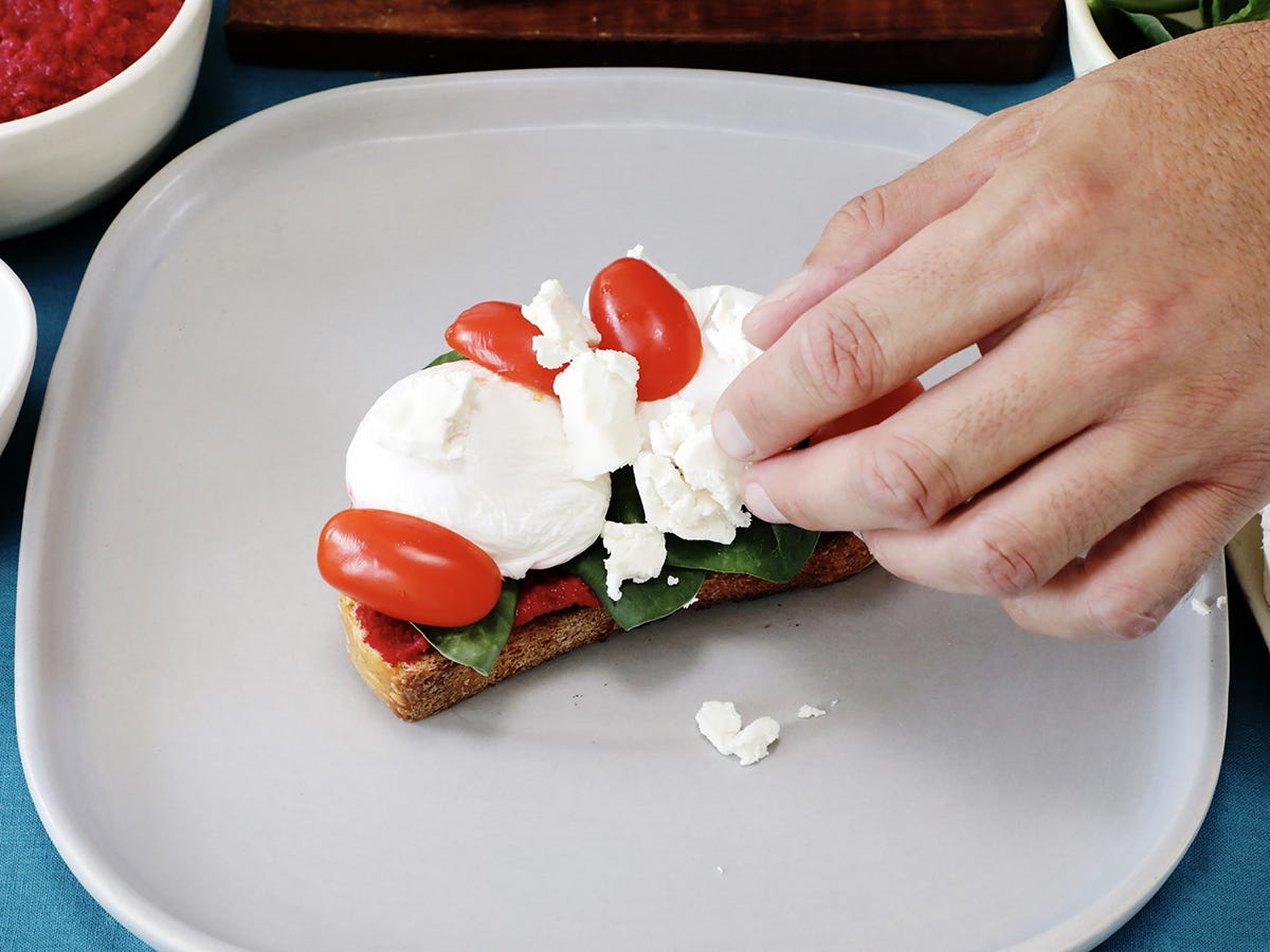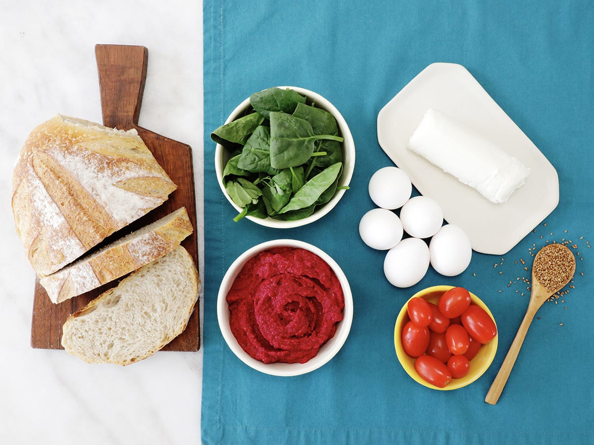 If you prepare beforehand, you’ll save loads of time. When you’re ready to make your beet hummus toast, all you have to do is slice the tomatoes, poach the egg, and toast the bread. Then, spread the hummus on the toasted bread and pile on the rest of the ingredients.