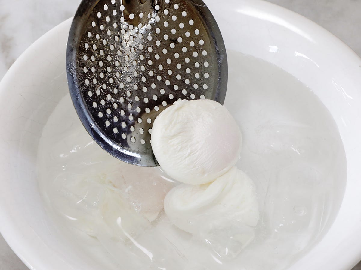 Discard the liquid that drips into the bowl. Pour the egg that’s in the strainer into a small bowl and prepare to poach.