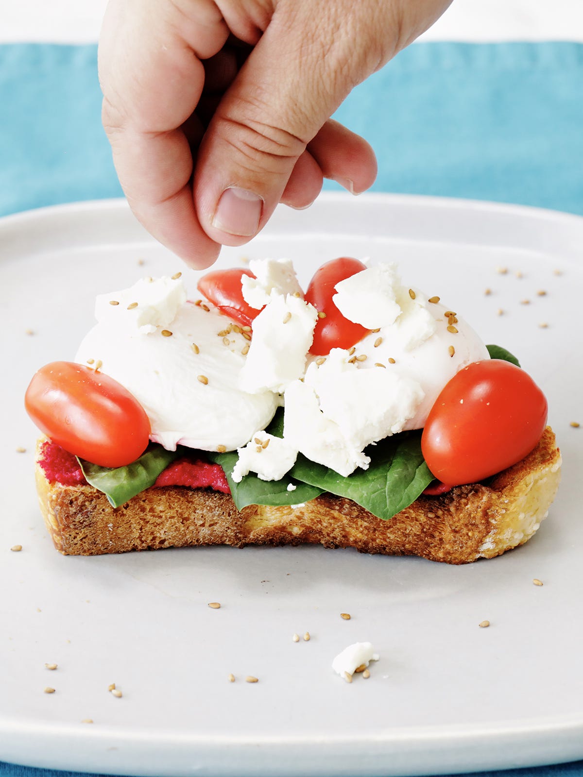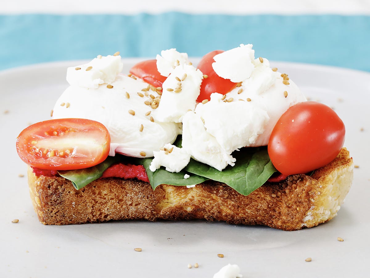 We recommend you eat this toast immediately, as the hummus can make the toast soggy if it sits for too long.