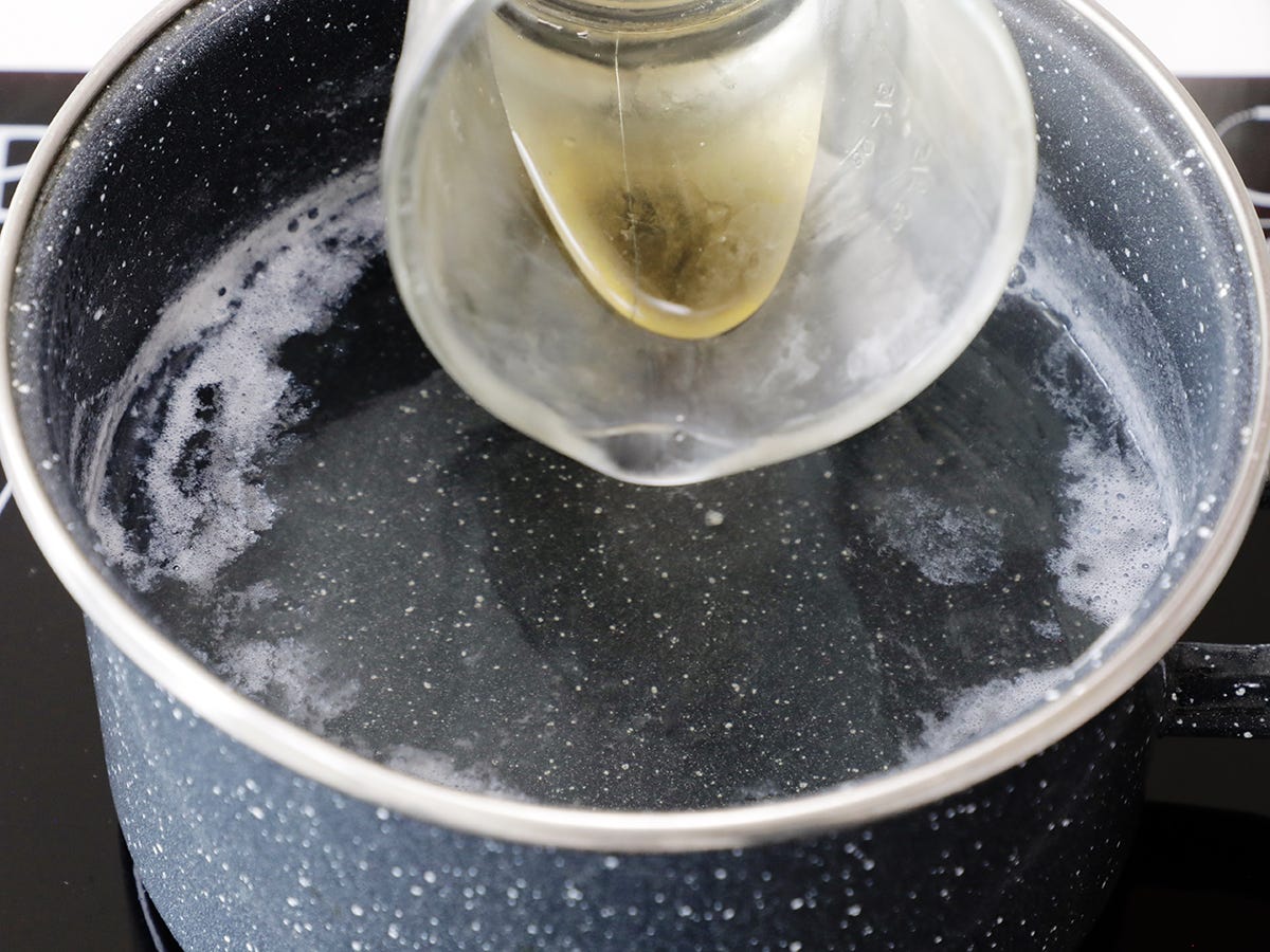 Prepare to poach the eggs by heating a pot of water over medium-high heat. Just before it simmers, pour in the white vinegar or apple cider vinegar. This increases the acidity of the water, helping the egg whites denature (or coagulate) faster. Lower the heat so the water stays just below a simmer as you prepare your eggs.