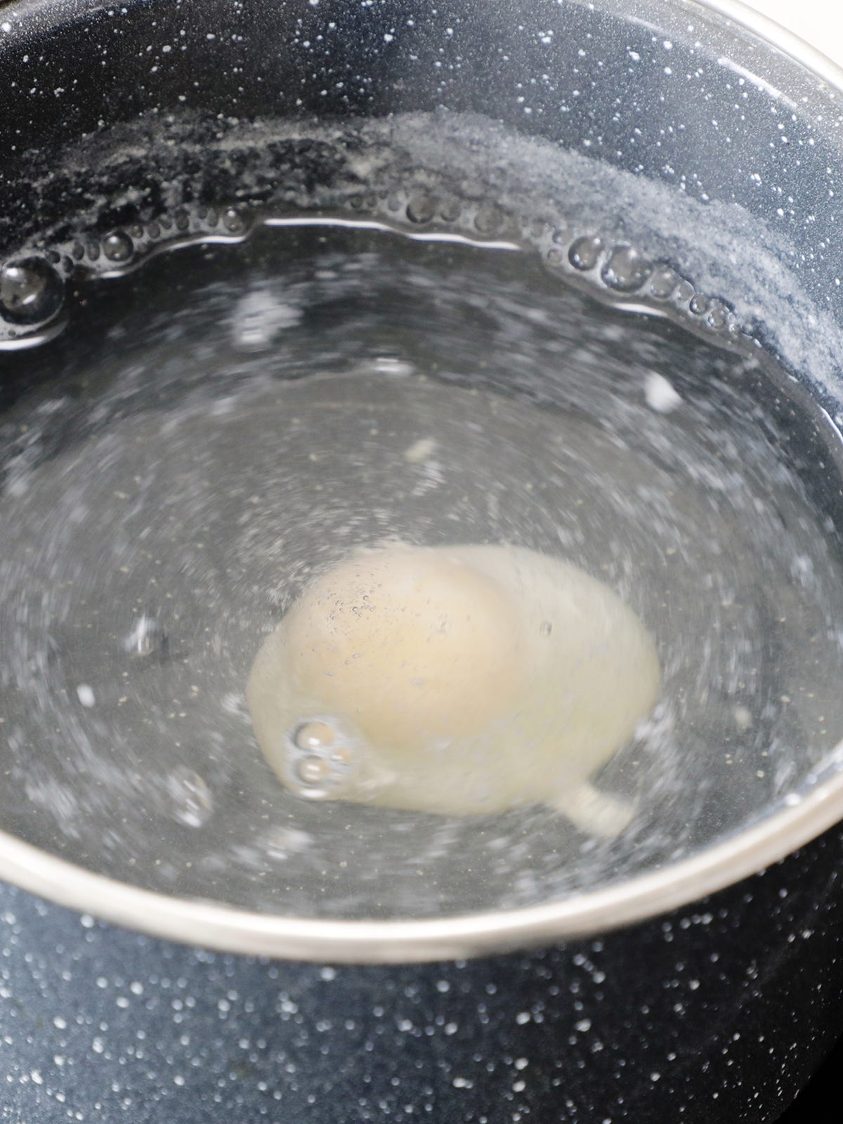 Gently slide the egg into the center of the moving whirlpool in the pot. Let the egg cook in the water for three minutes without stirring. If you like your eggs with a firmer yolk, cook for an additional 30 seconds to 1 minute. Don’t cook for more than 5 minutes or you’ll end up with a rubbery egg.