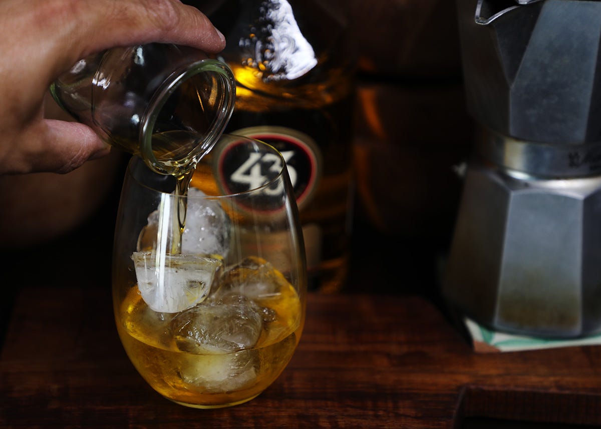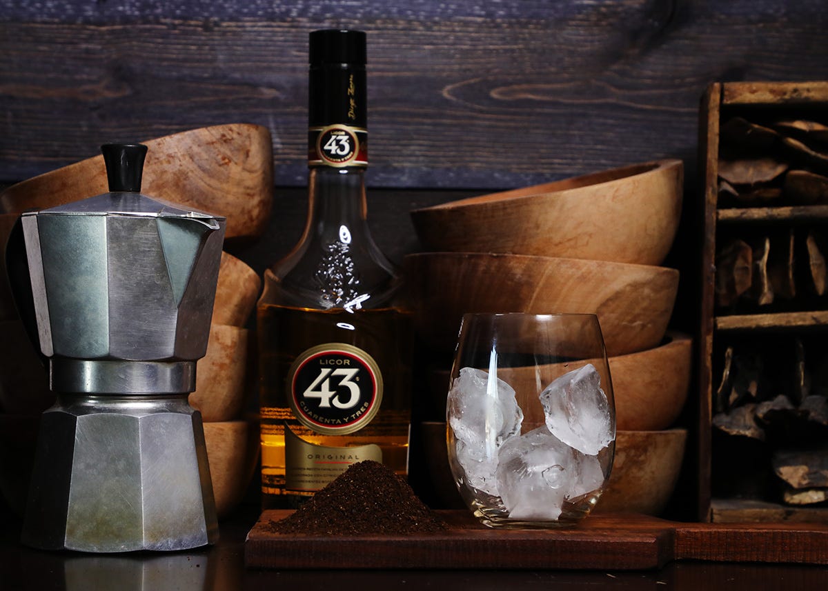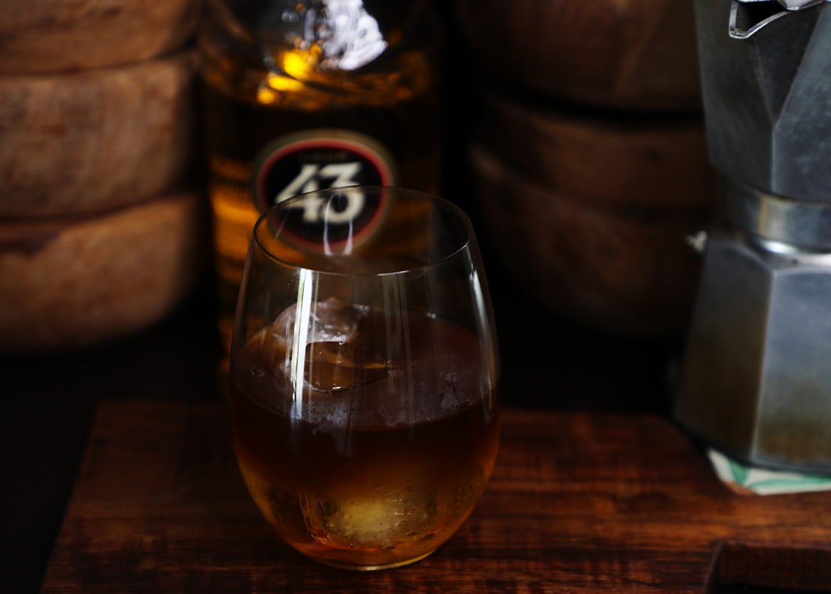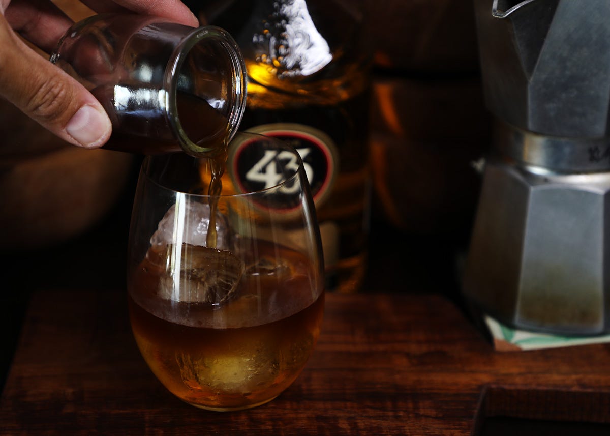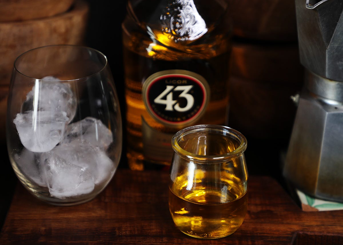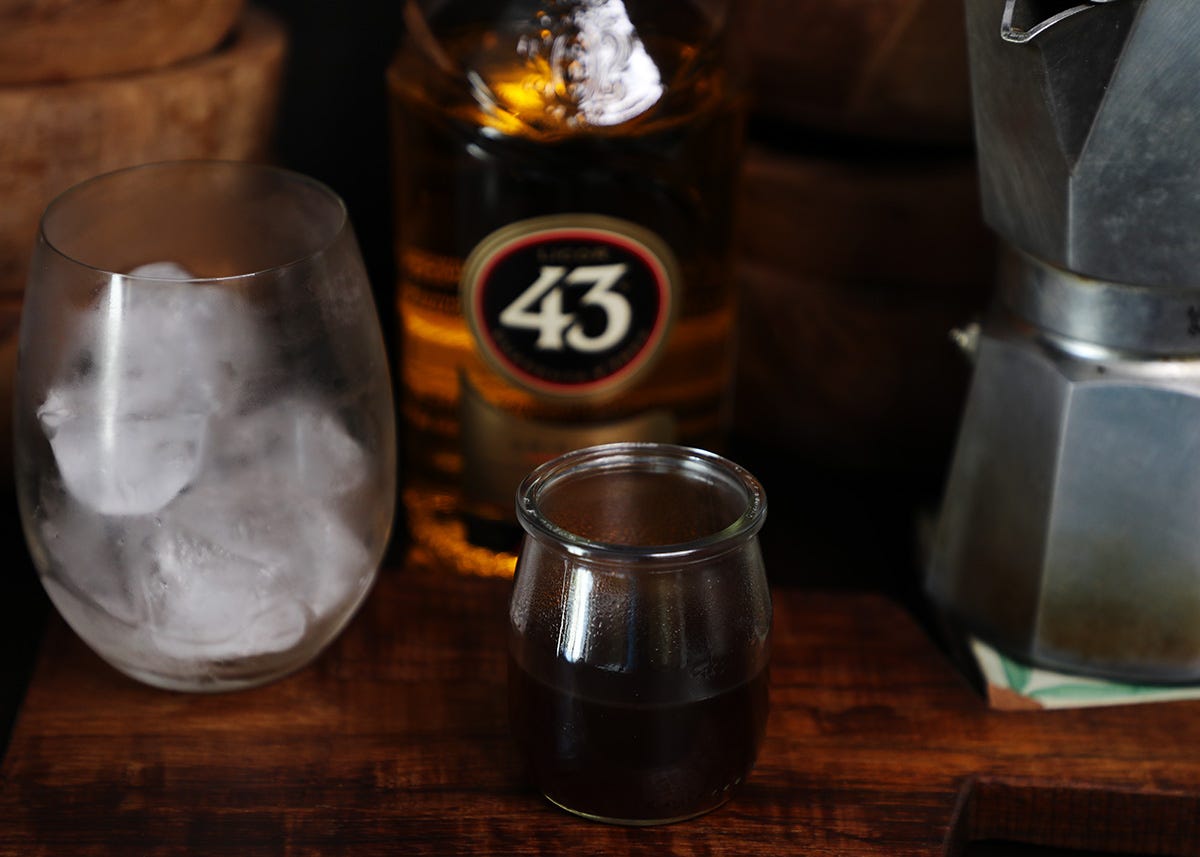 Place 4 ices cubes in each glass, then add the Licor 43, then slowly pour the coffee over the ice.