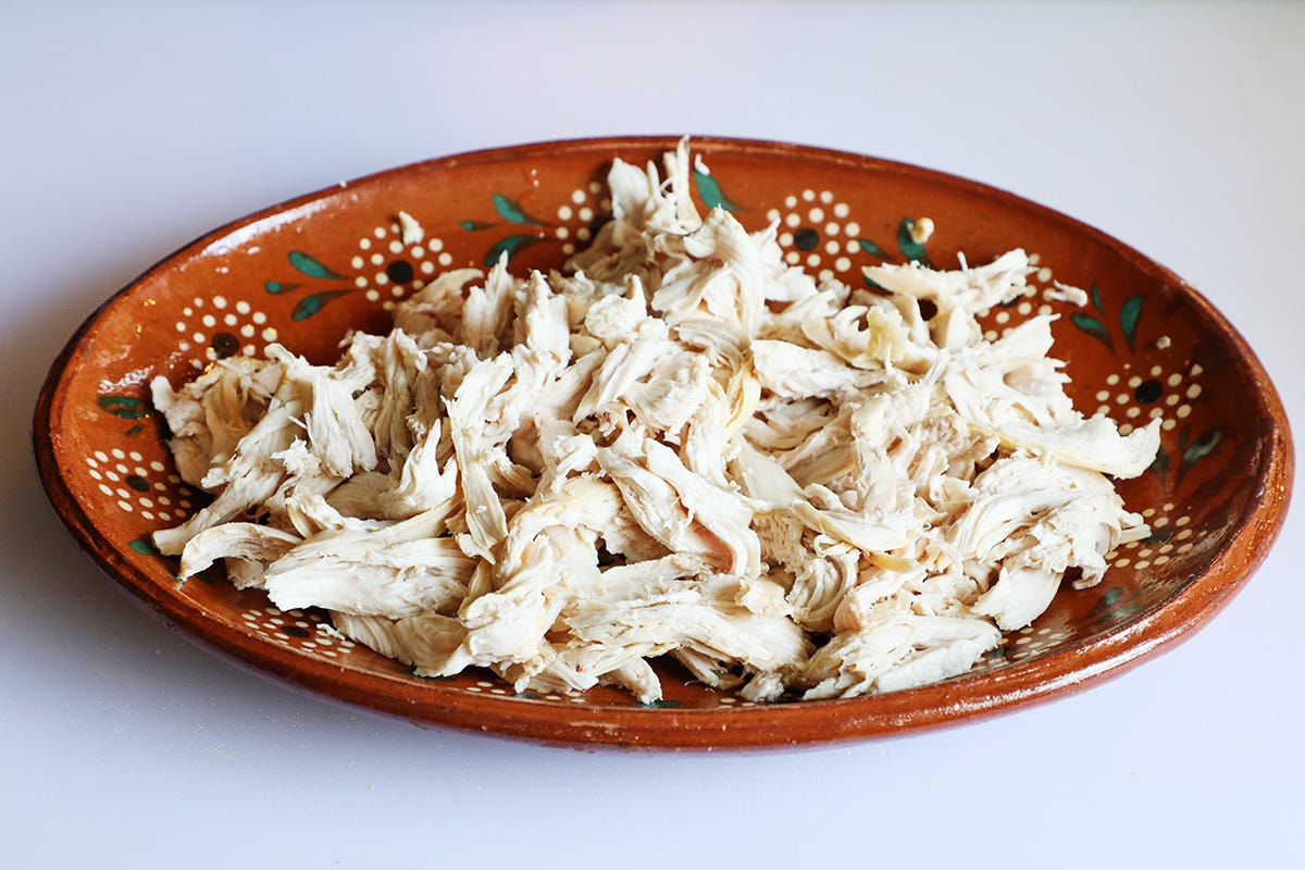 Once the chicken is cool use your fingers to pull it into thin strips.