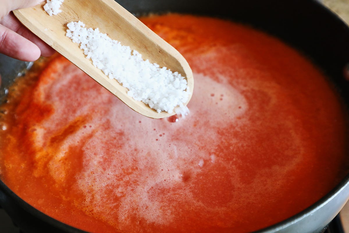 Simmer the broth for 30 minutes until it takes on a deep red color and has reduced approximately 1 inch. You want the broth to have some body but not be as thick as a salsa. Add 1 teaspoon of salt and adjust as needed. If your broth is too thick just add water or chicken broth a ¼ cup at a time until it reaches the consistency you want.