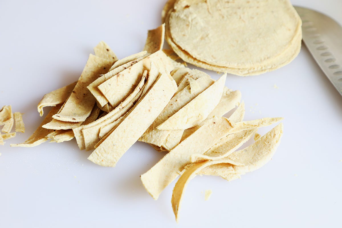 Start by cutting the tortillas into ¼” to ½” strips. Separate the strips if they are sticking together.