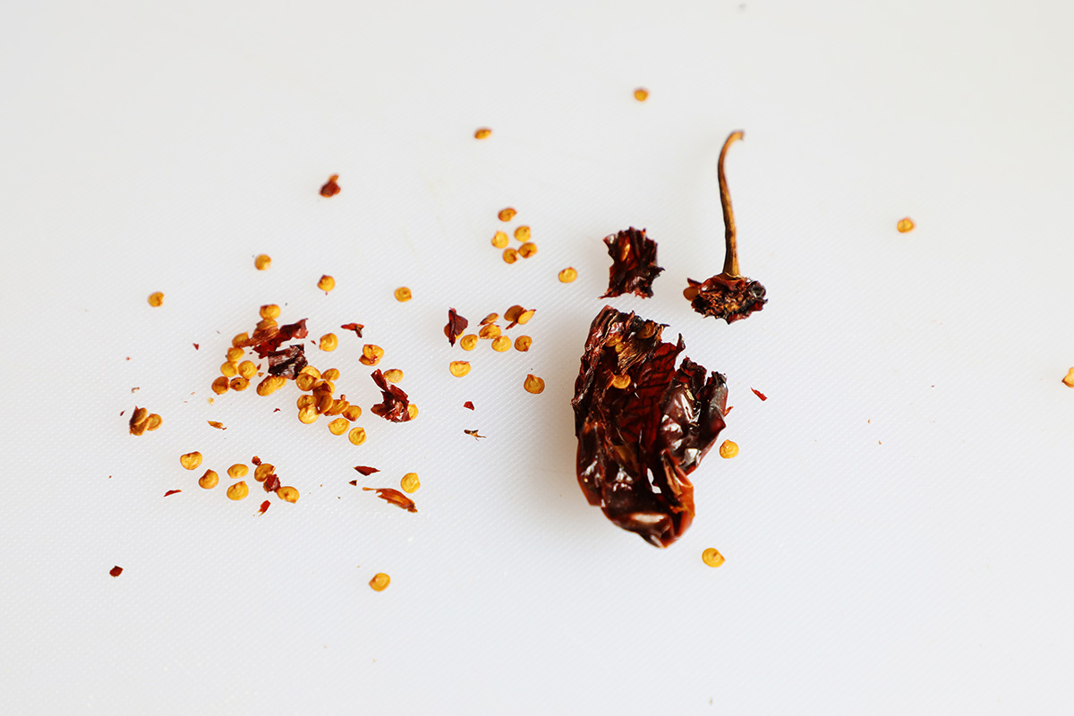 If you are using a dried chile morita remove the stem and seeds and discard.