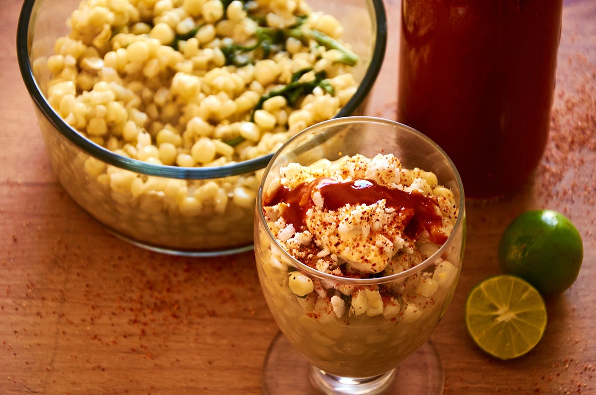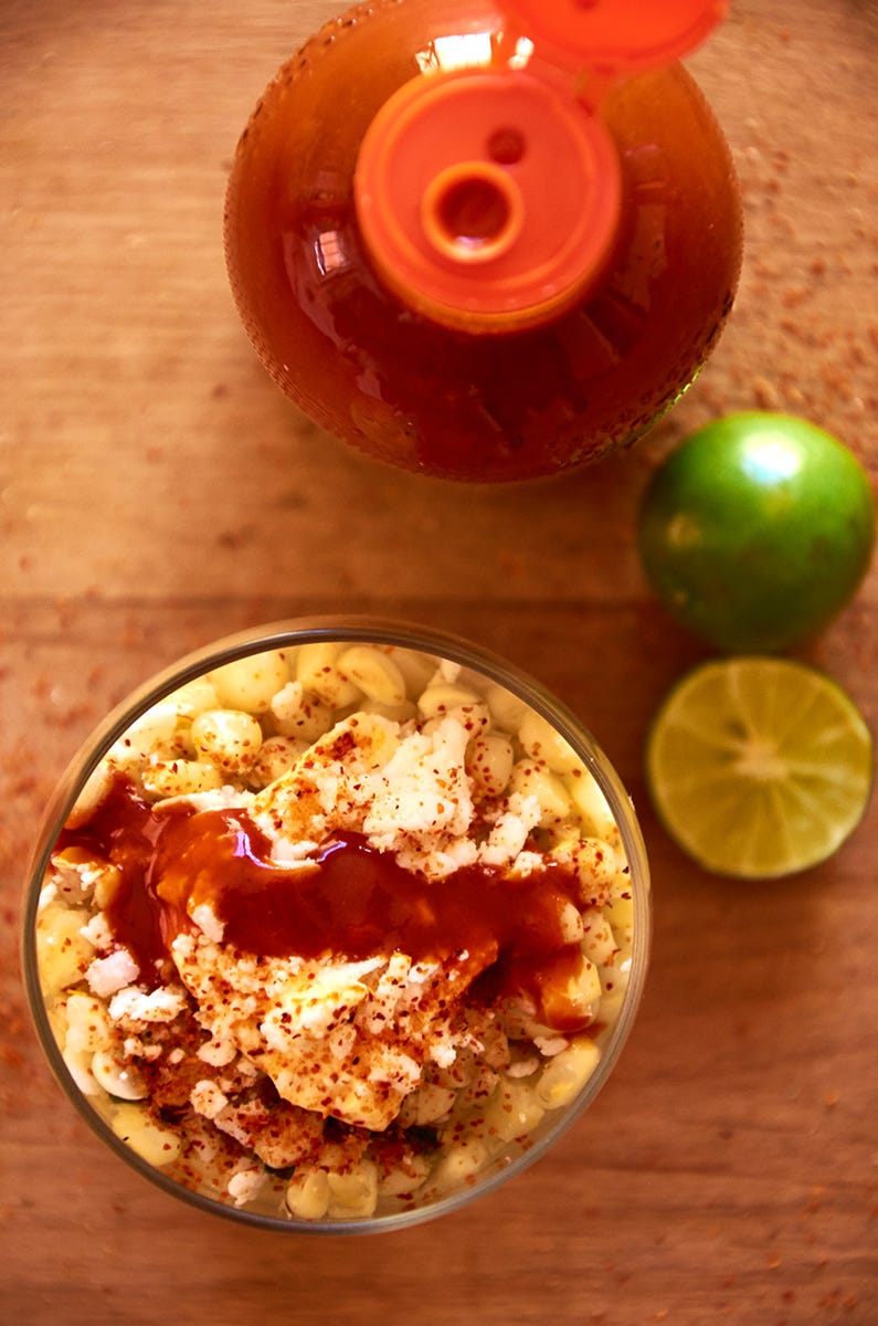 Serve your corn warm in a cup and then add the toppings of your choice. My perfect cup is like the one in the photo, just a squirt of lime juice, a pinch of salt, a dab of mayonnaise, a sprinkle of chili powder, and a good squirt of hot sauce.
