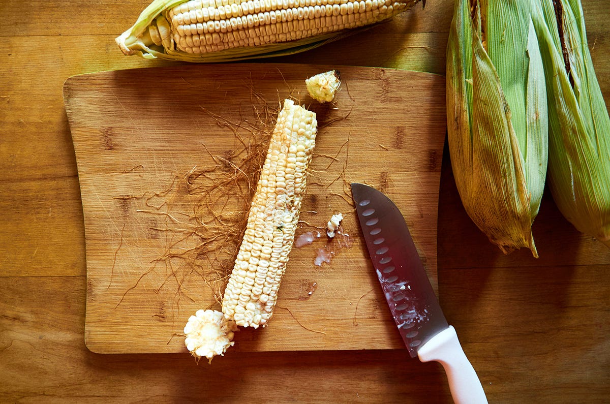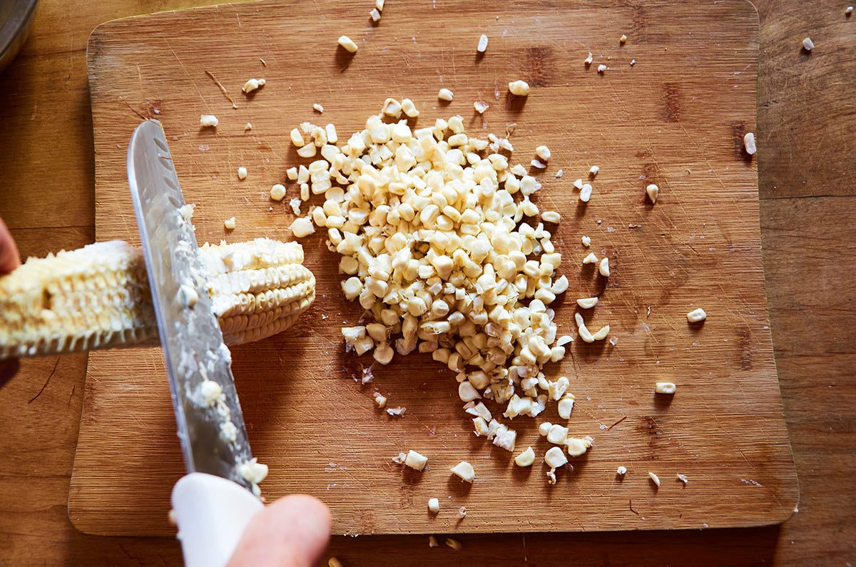 Remove the kernels from the cob. Hold one end of the cob with your hand and place the other end of the cob on the cutting board. Hold the cob at a 45-degree angle. Use a sharp knife to cut the kernels off and be sure to always cut away from your hands and body.