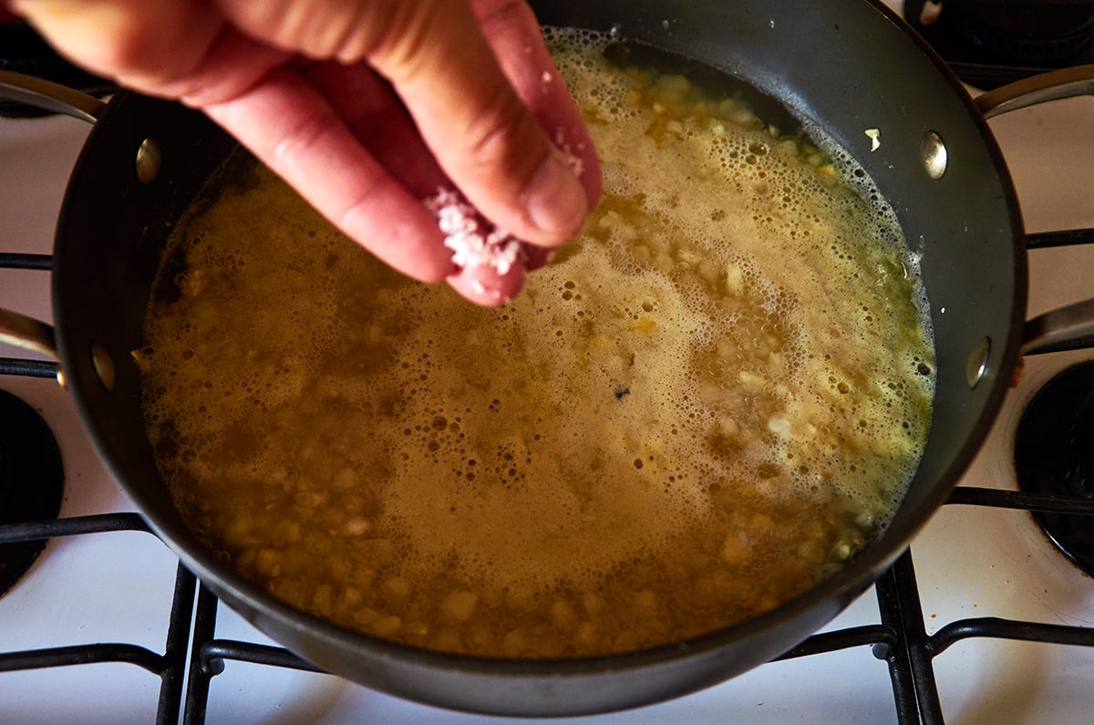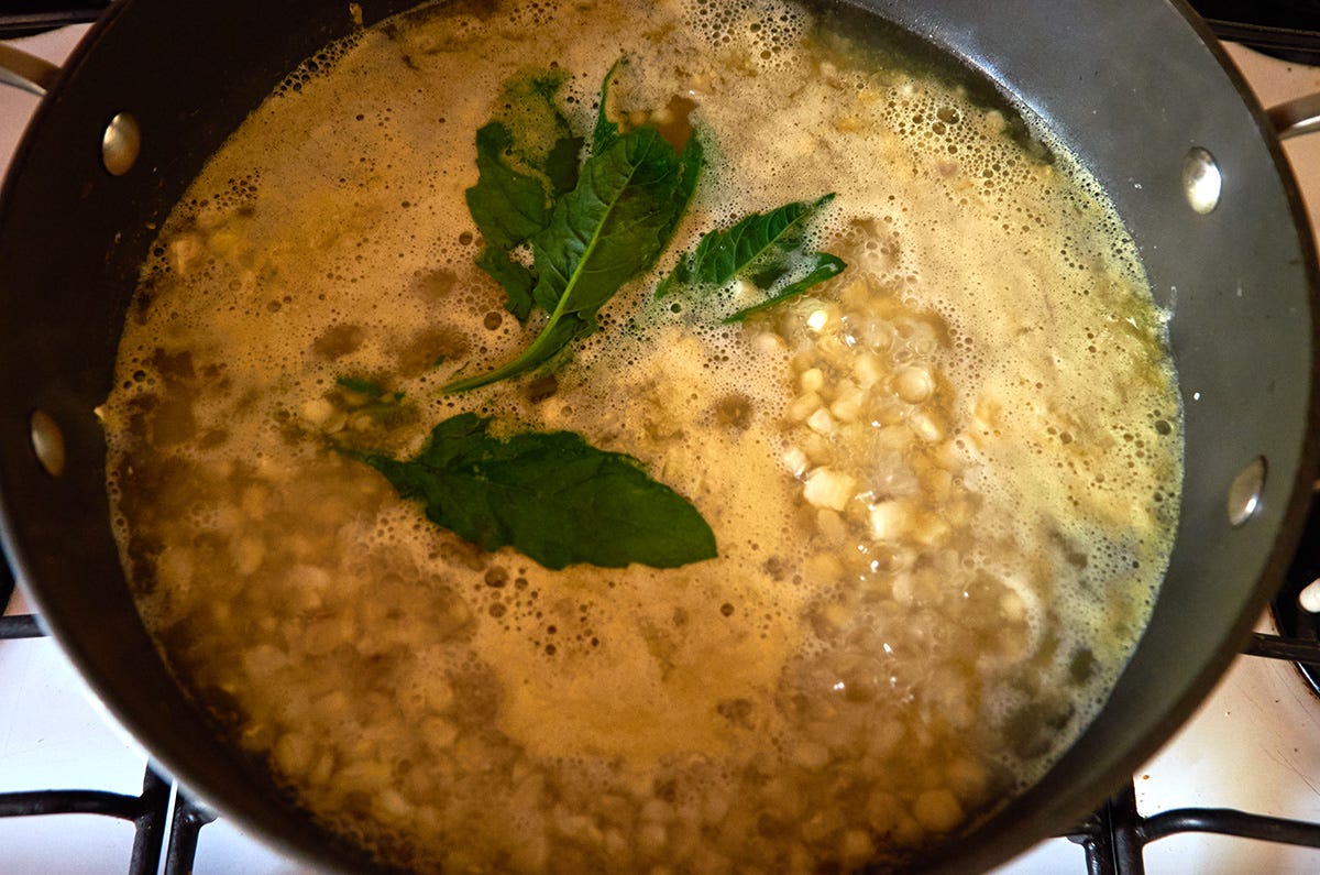 Add the epazote and salt. Bring the water to a boil then reduce to medium.