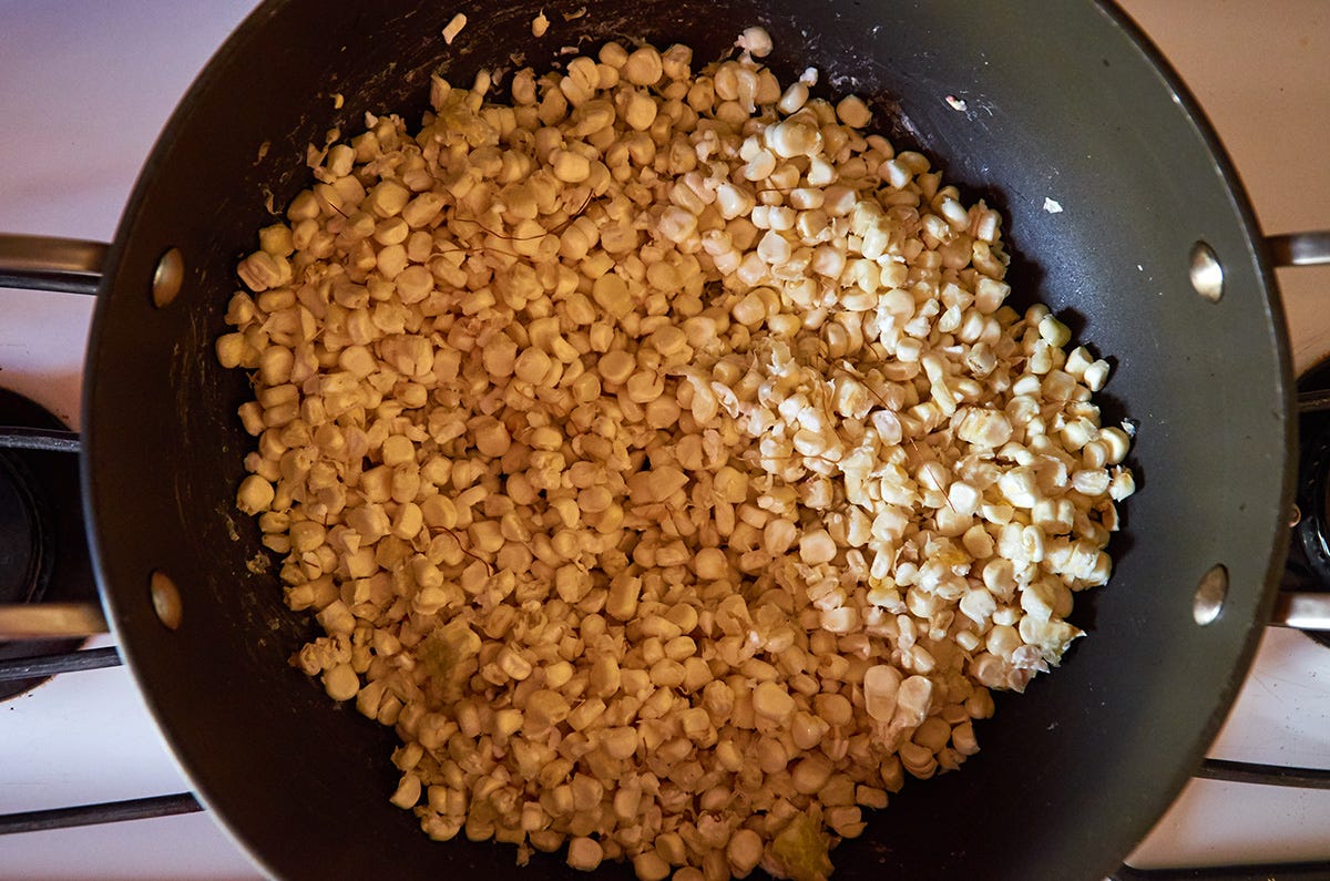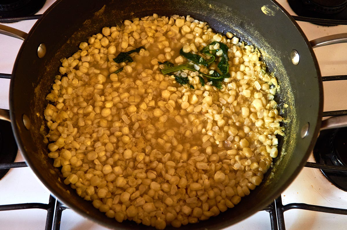 Cook until about ⅔ of the liquid has evaporated. If the corn is still too tough for you after the liquid has reduced add 1 cup water and cook until you get the desired texture. Repeat if needed. You want a little bit of liquid to remain. It goes in each cup when you serve.