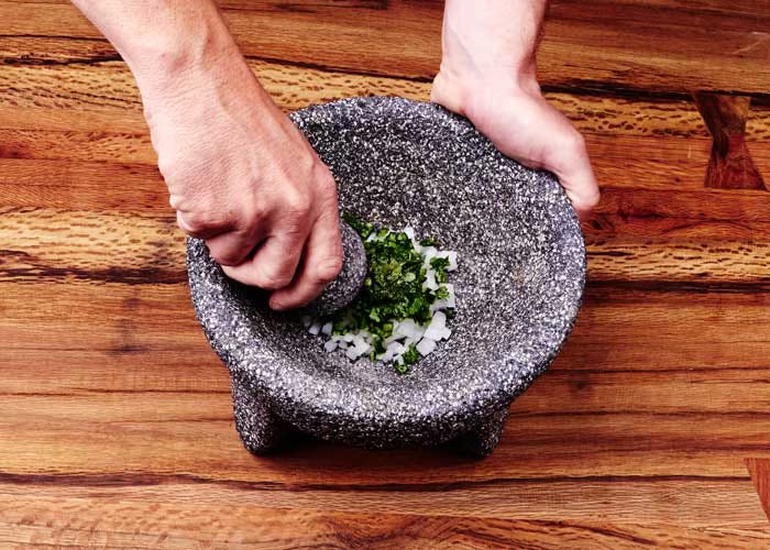 If you don’t have a molcajete, you can approximate this method by very, very firmly mashing the onion, chile, and cilantro in a mixing bowl with a fork and then follow the remaining steps.