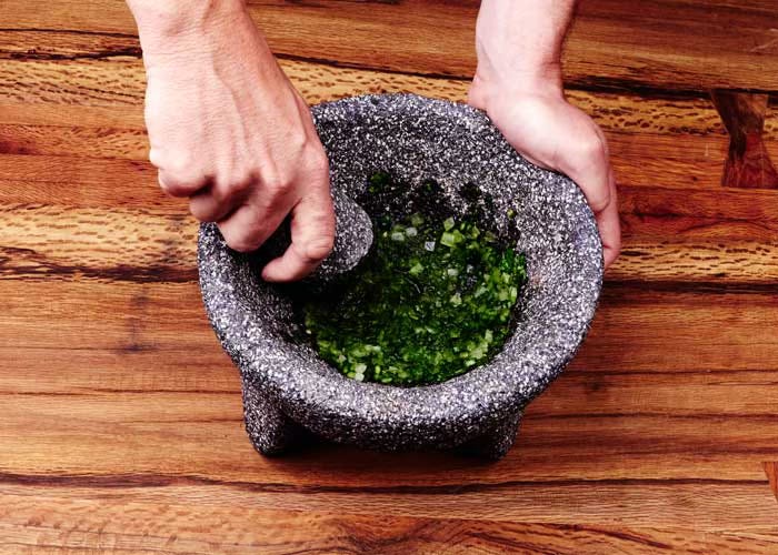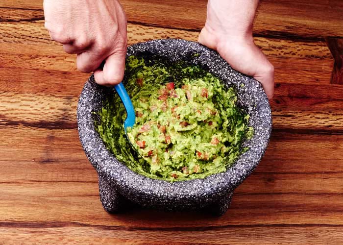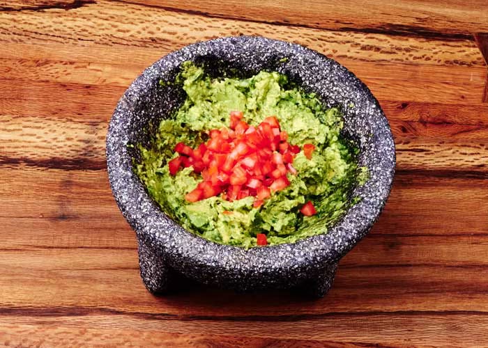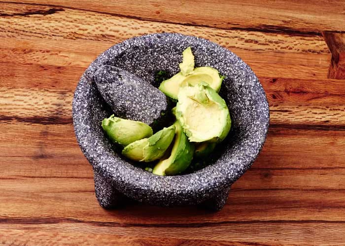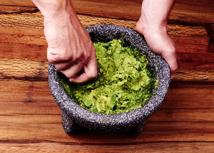 Our favorite way to make guacamole is in the molcajete, a traditional Mexican mortar and pestle. Making it in the molcajete gives you superior results because by grinding the ingredients in the molcajete the volatile oils of the vegetables are released and the flavors are more evenly dispersed throughout the guacamole.