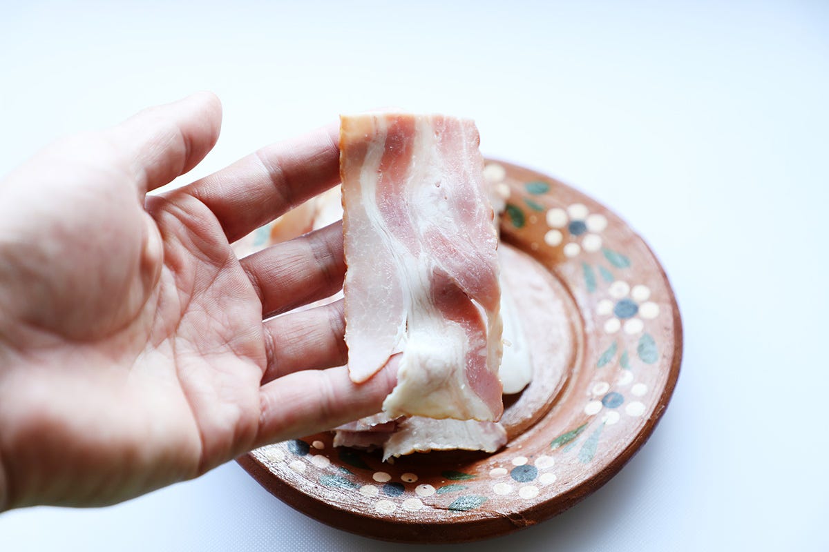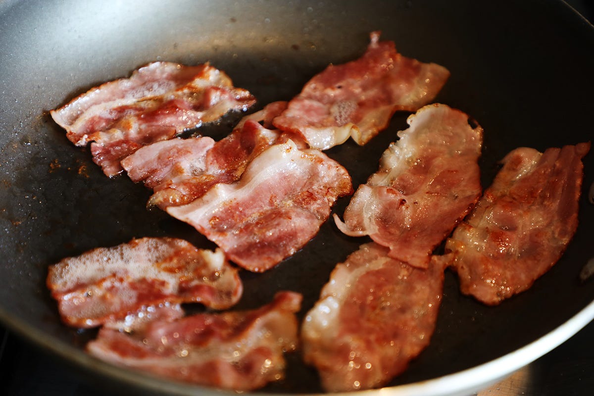 * In a medium-hot pan, cook the bacon until it has started to brown on both sides.