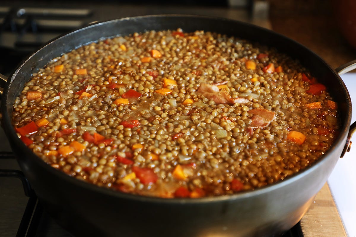 Add the browned bacon to the lentils and continue cooking over medium heat.