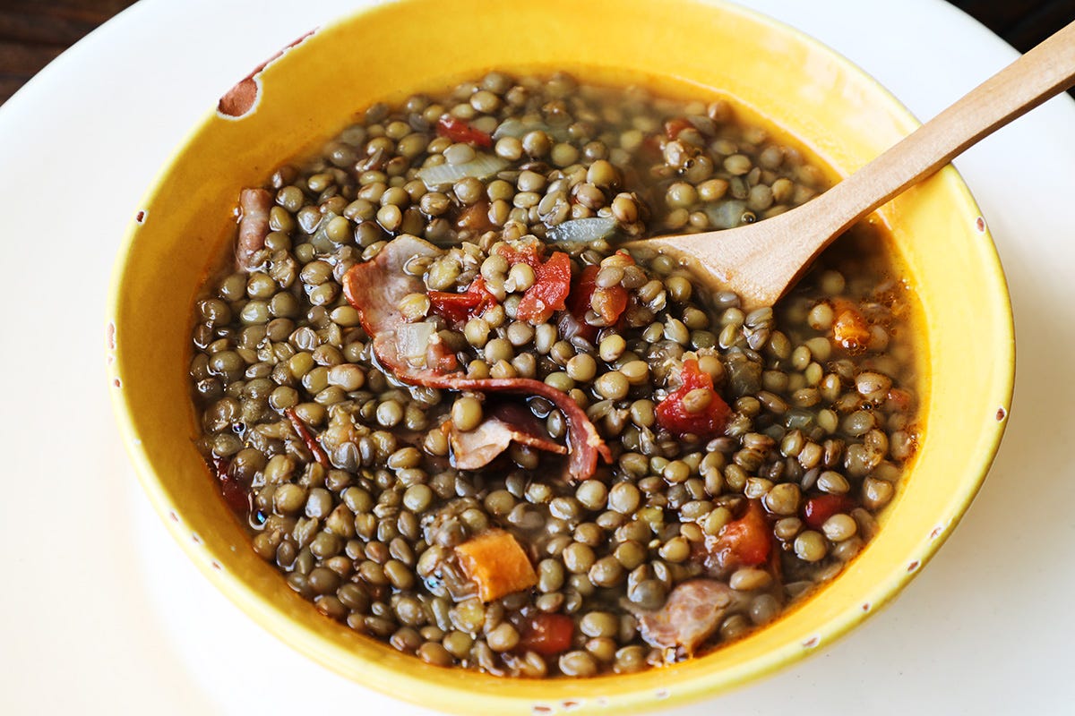 * Add the browned bacon to the lentils and continue cooking over medium heat. Remove the half onion from the lentils and discard.