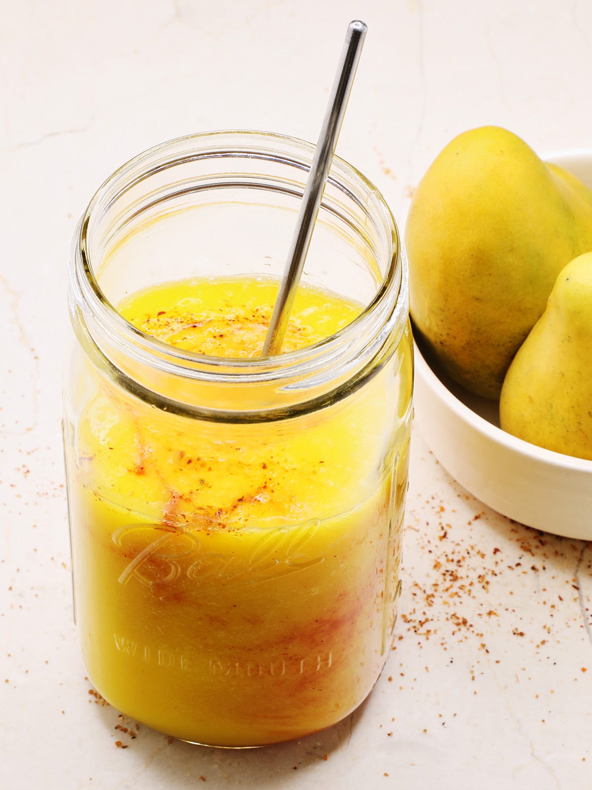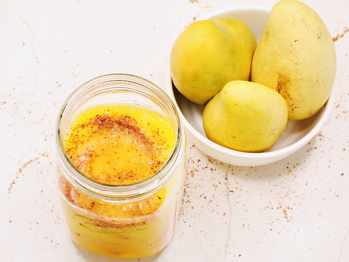 To get the best-tasting mangonada, you want really ripe mangoes that are at their sweetest and most flavorful. To know if a mango is ripe, gently press on it with your thumb. If it easily gives to the pressure it is ripe. If it is hard and doesn’t give in to the pressure it is unripe. Ripe mangoes also give off a delicious aroma whereas unripe mangoes do not.