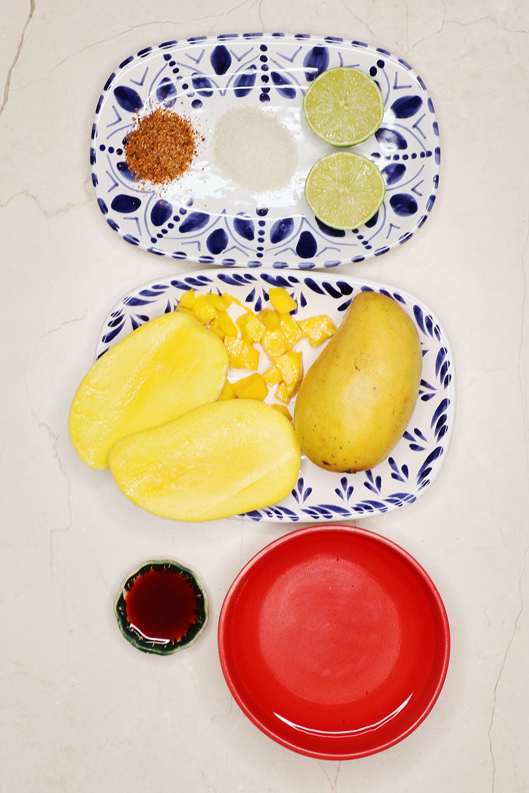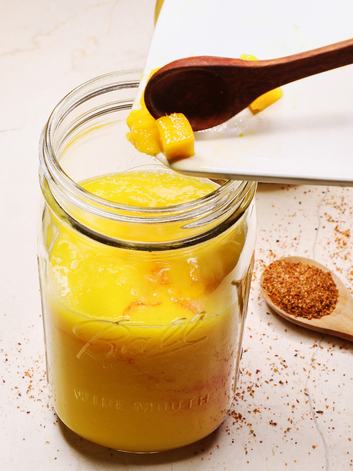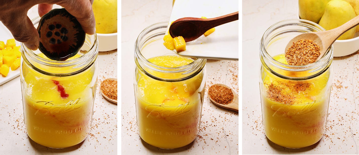 Add another ¼ of the blended mango and another tablespoon of the chamoy. Then add ½ of the reserved chopped mango and ½ teaspoon of the Tajín chili powder.