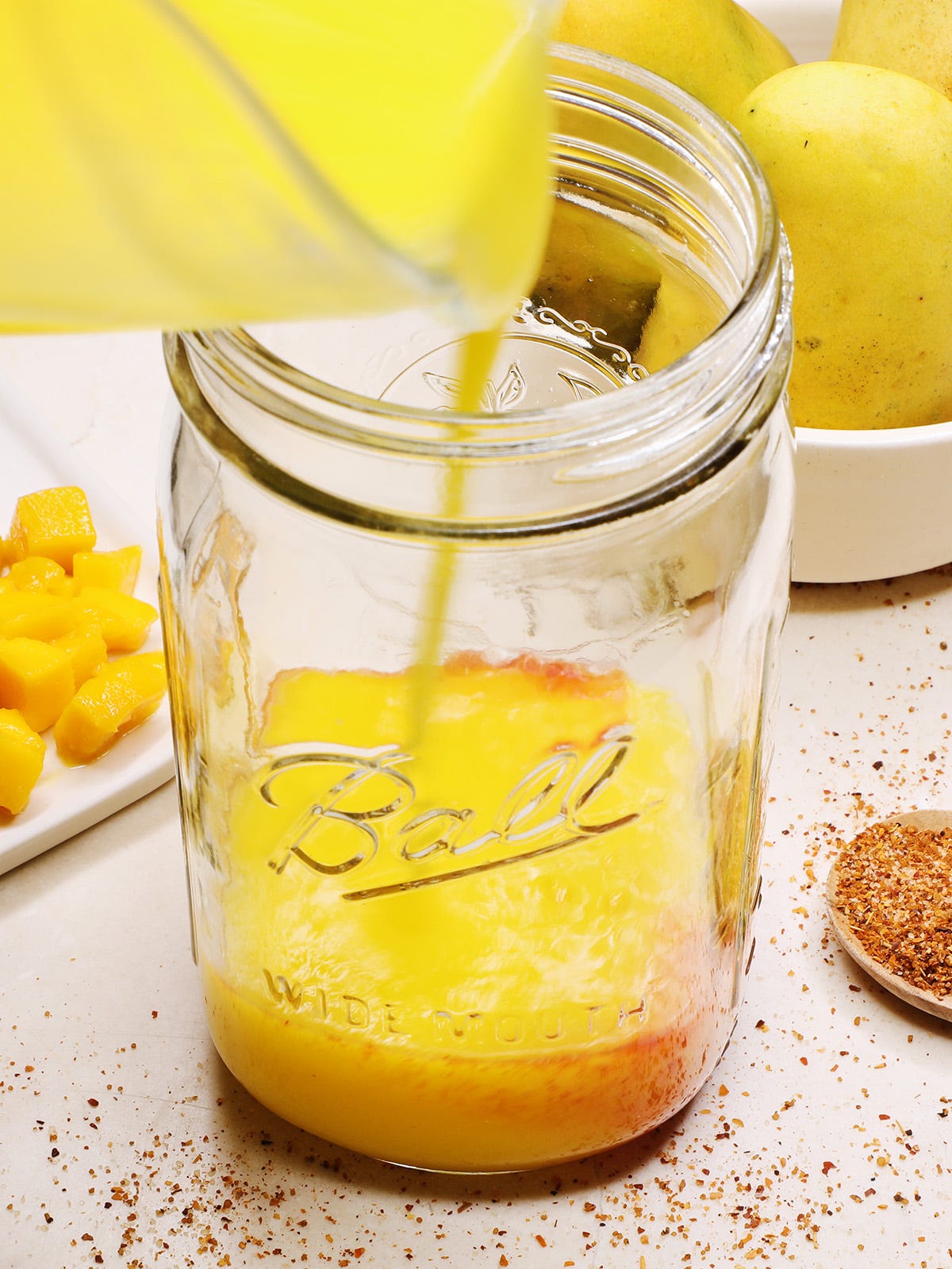 Start by removing the flesh of one mango and cut into ½″ pieces and set aside. Remove the flesh of the other 2 mangoes and blend with 1 cup of water, 1 tbsp. sugar, and the juice from the lime until smooth.