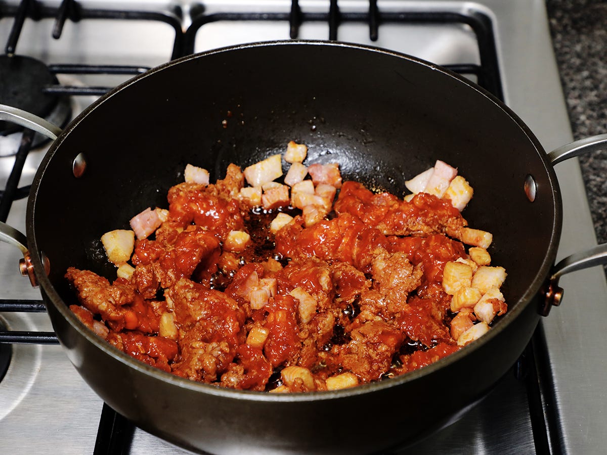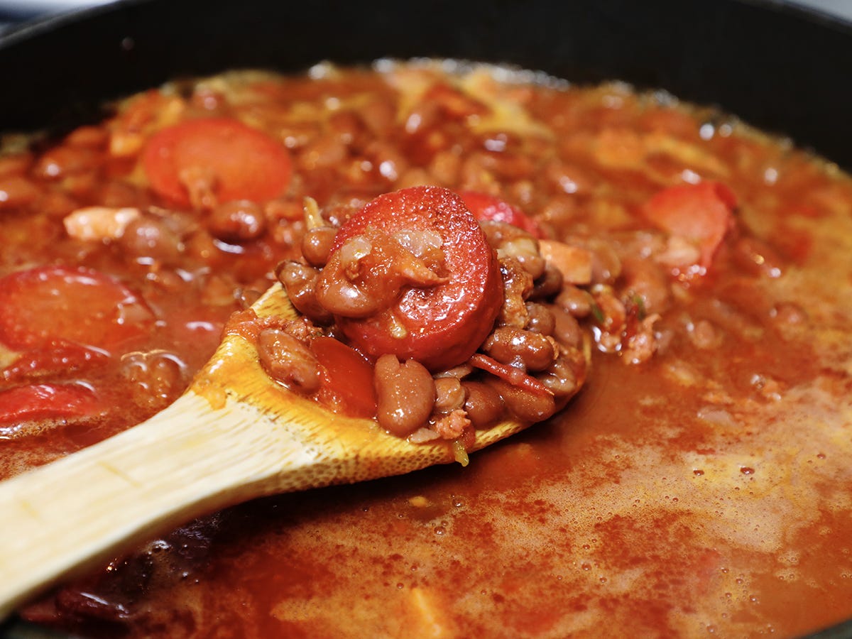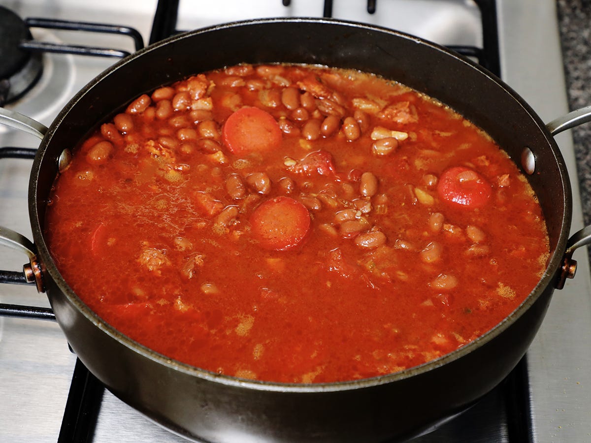 Our Mexican charro beans are shaping up nicely! Here’s what your dish should look like after the juice has reduced slightly.