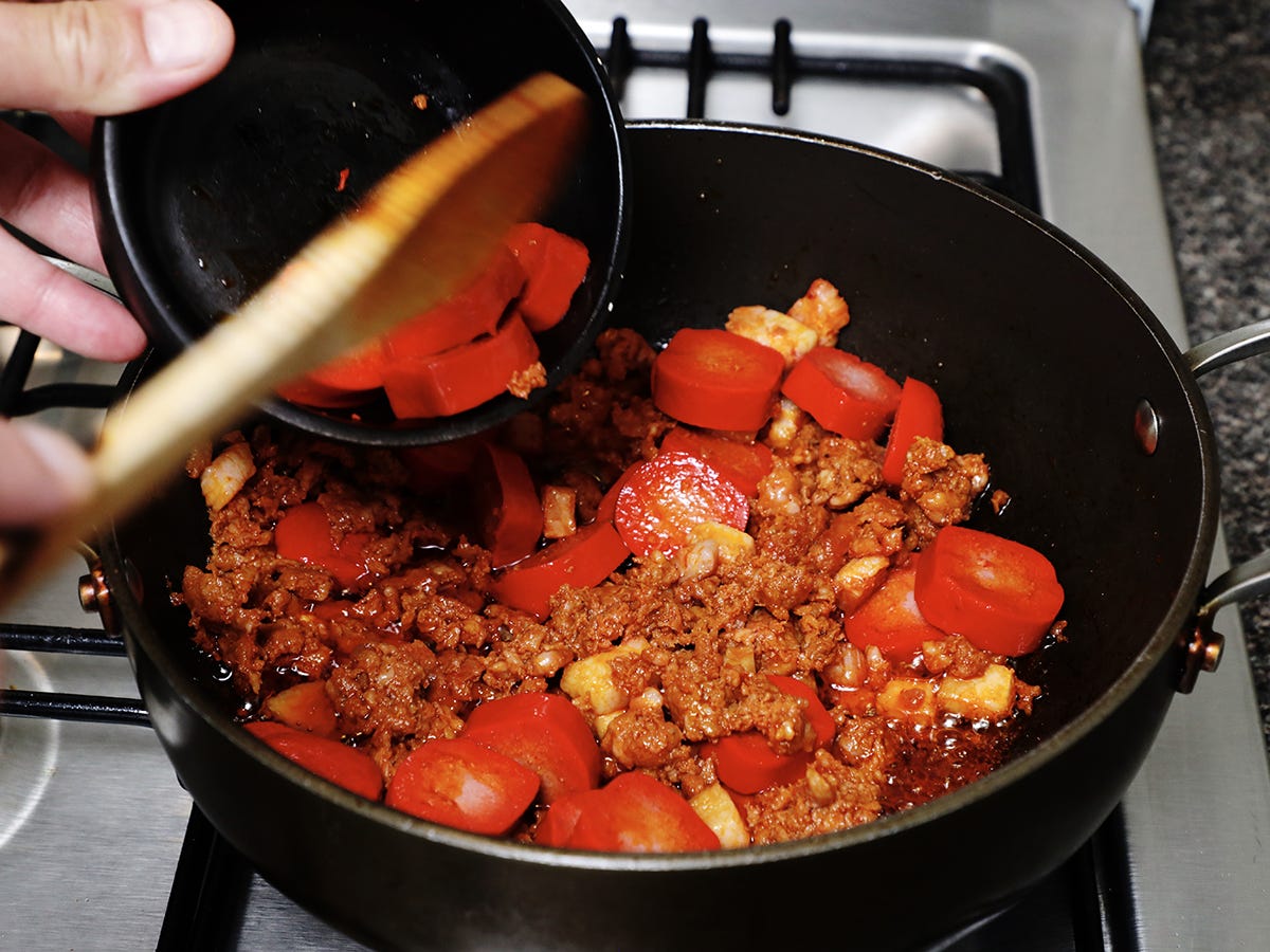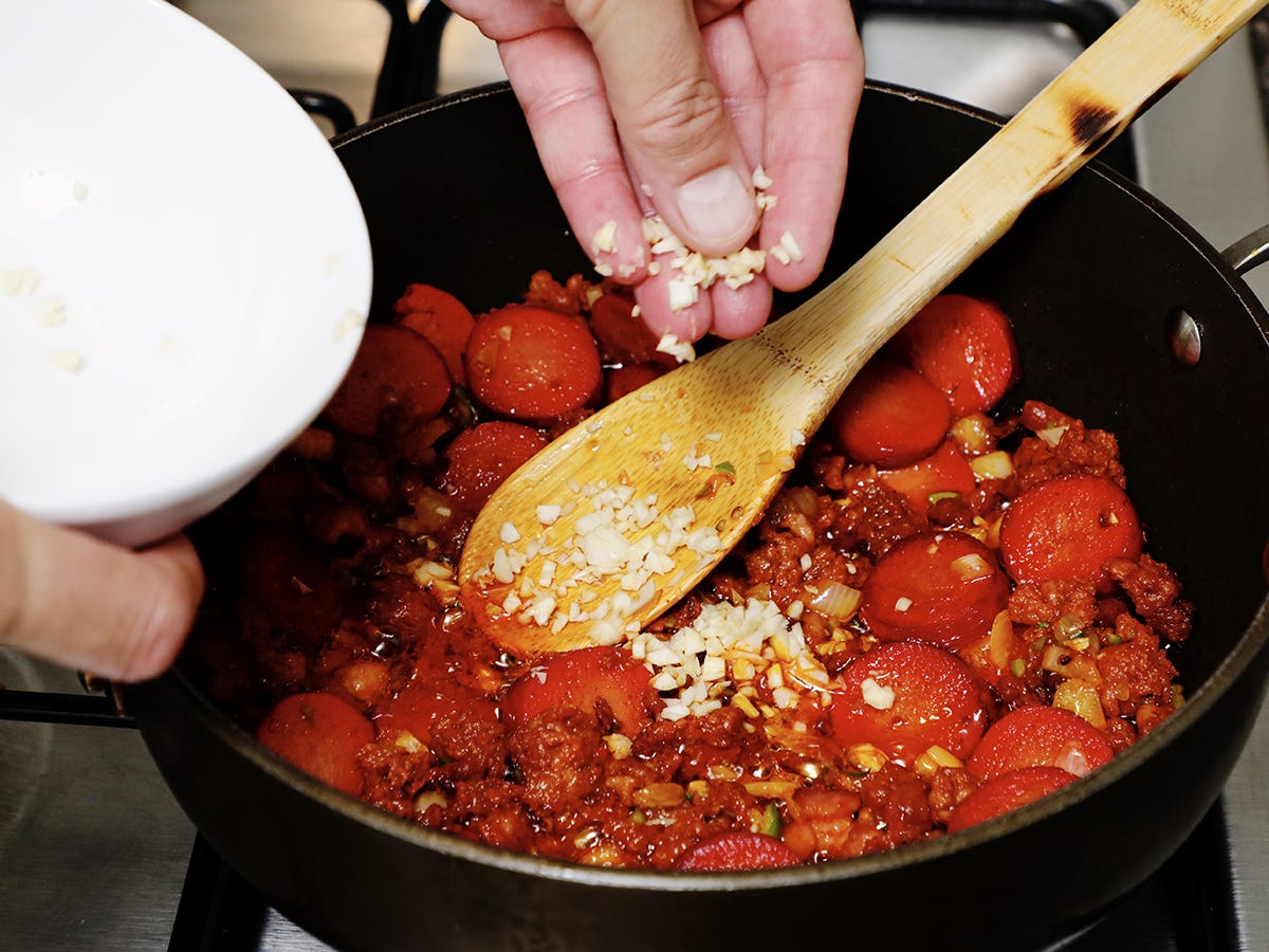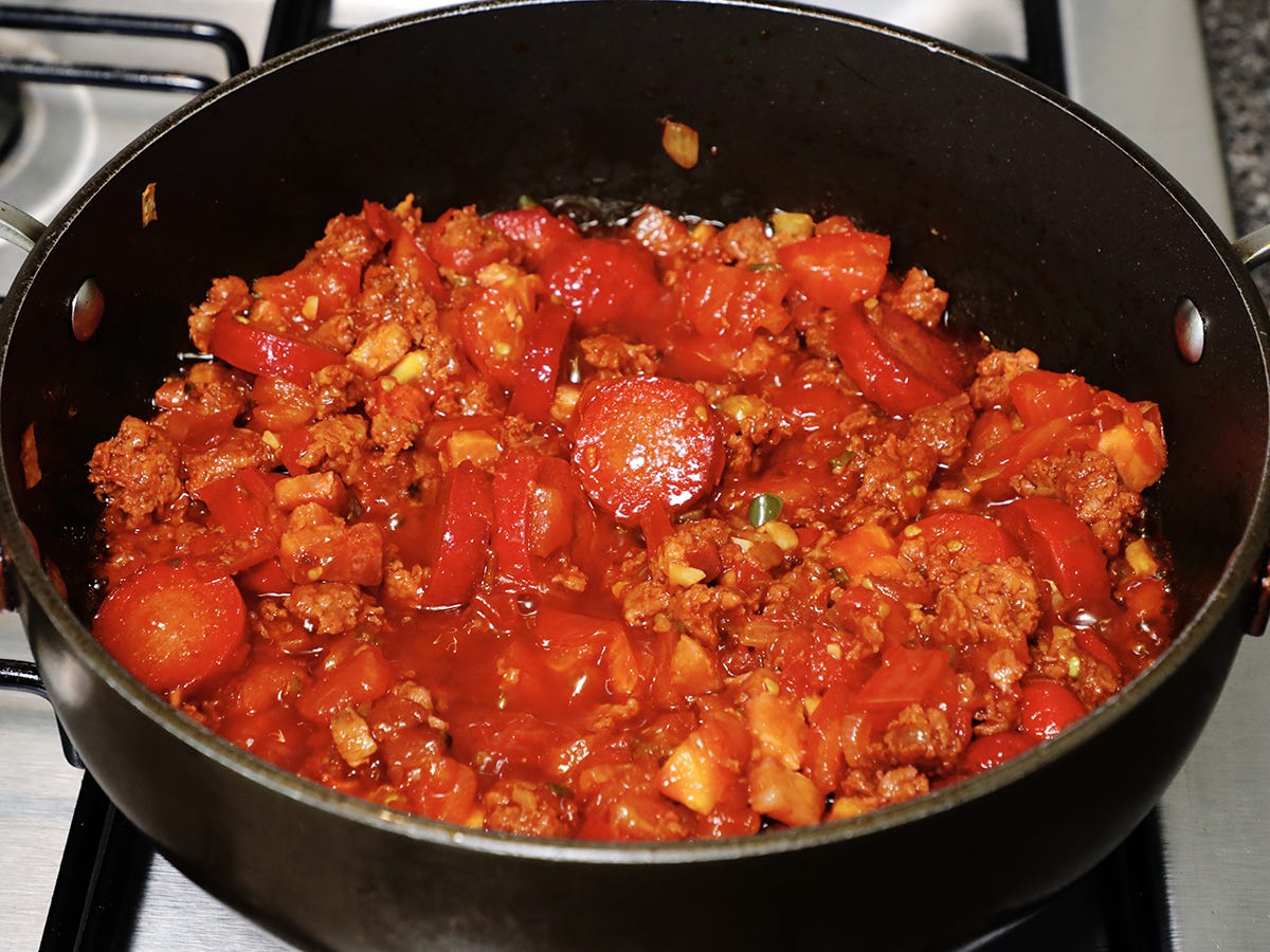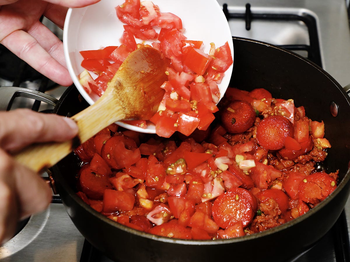 Spoon the diced tomatoes into the pot and simmer until the tomatoes release their juices and the liquid reduces slightly.