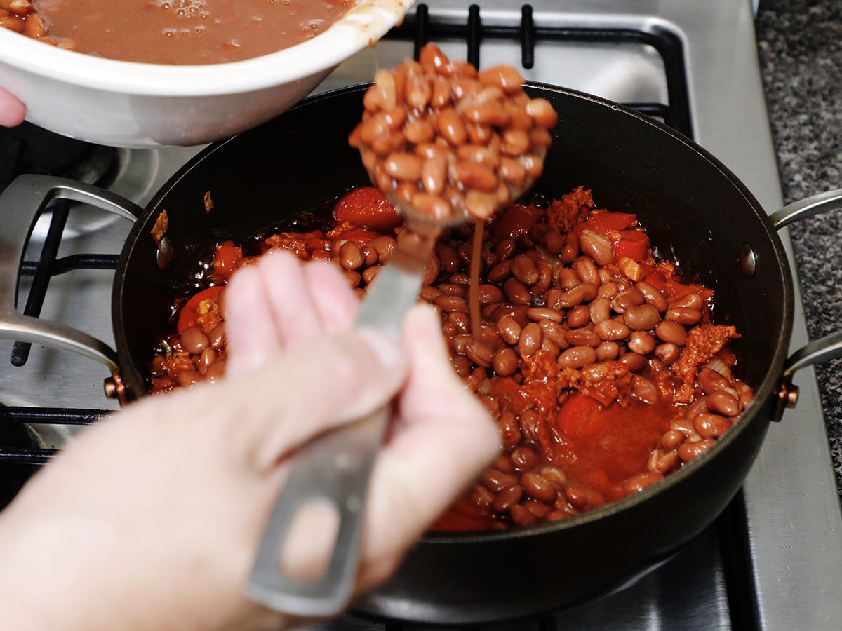 Next, spoon in the beans, stir, and cook for 10 minutes over medium heat. No need to cover, but be sure the liquid doesn’t reduce down too much