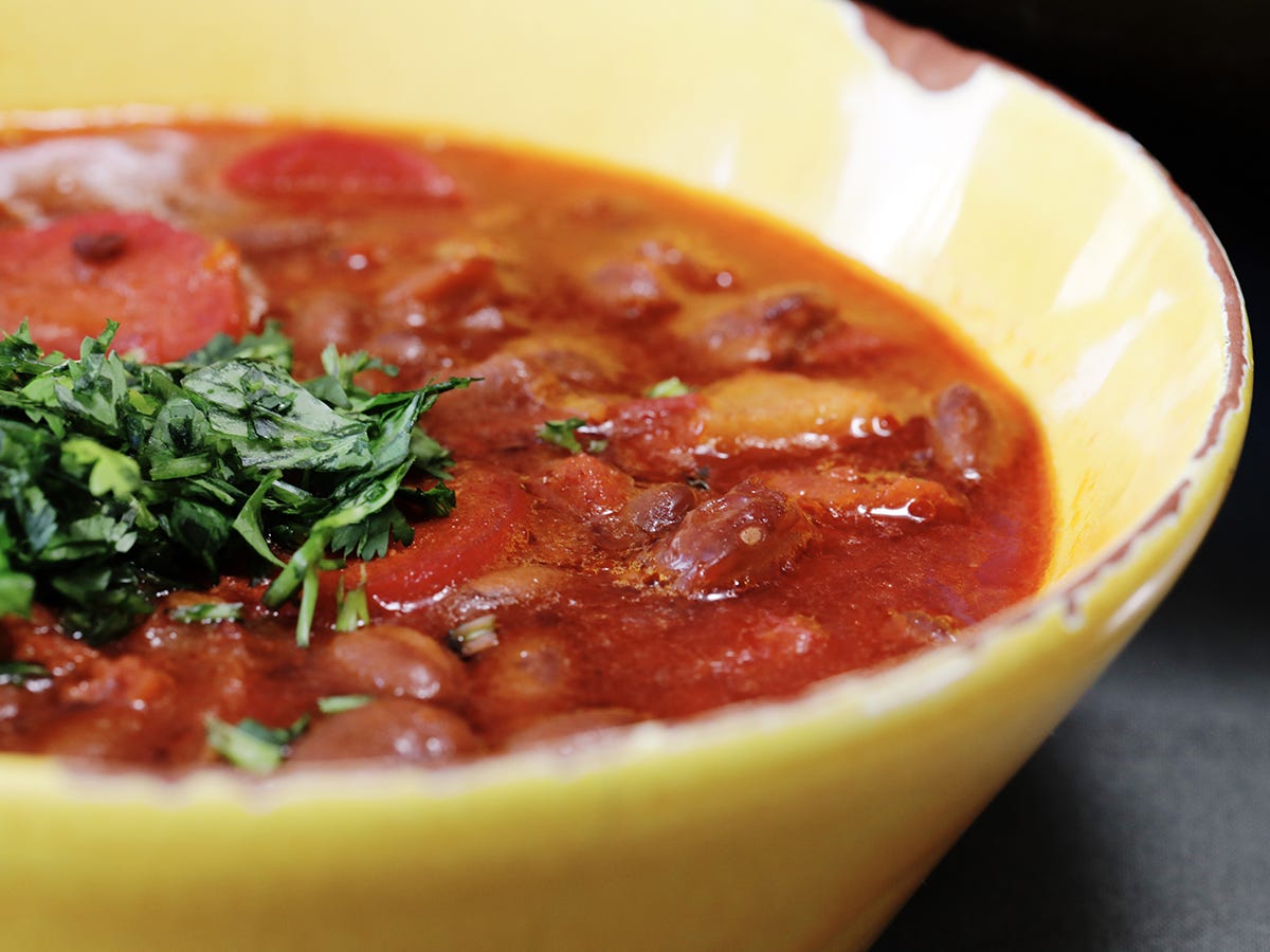 Once the beans are cooked, all you need to do is chop the veggies and meat, sauté, add the beans and garnish with a bit of cilantro. Heat up some fresh corn tortillas or a nice, crusty bread and you’re ready to eat!