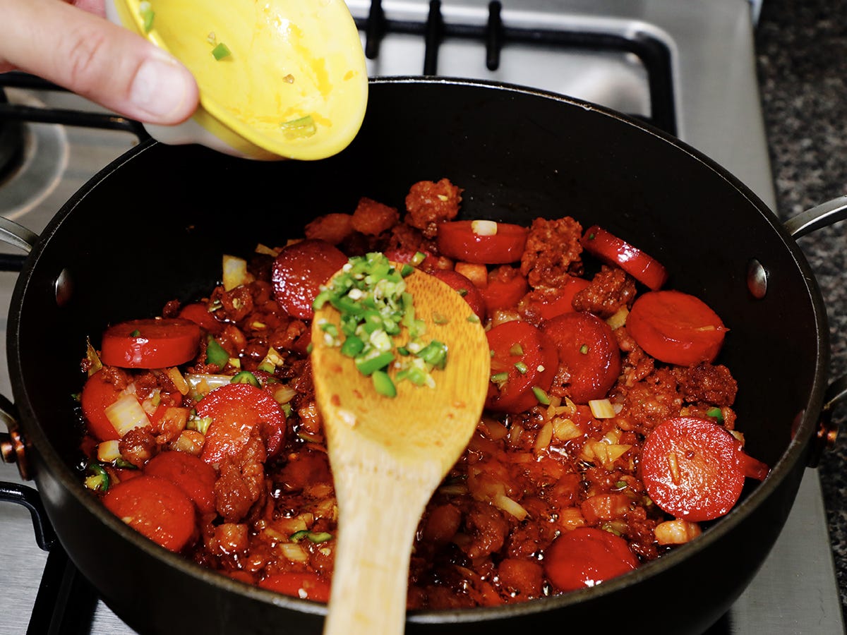 Next, add the chorizo to the bacon and grease. Stir and cook for two minutes.
