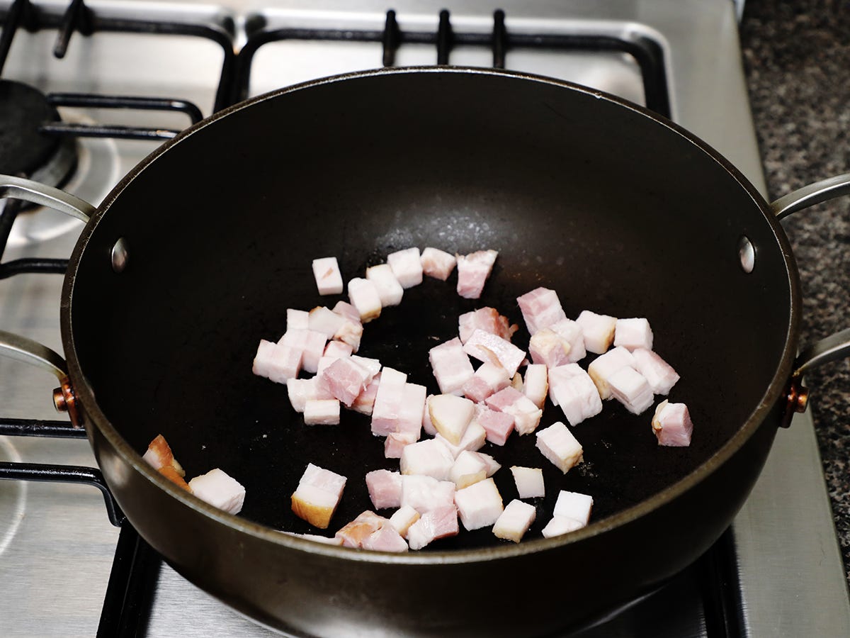 Heat a pot over high heat. Add the bacon and cook until the fat is released.