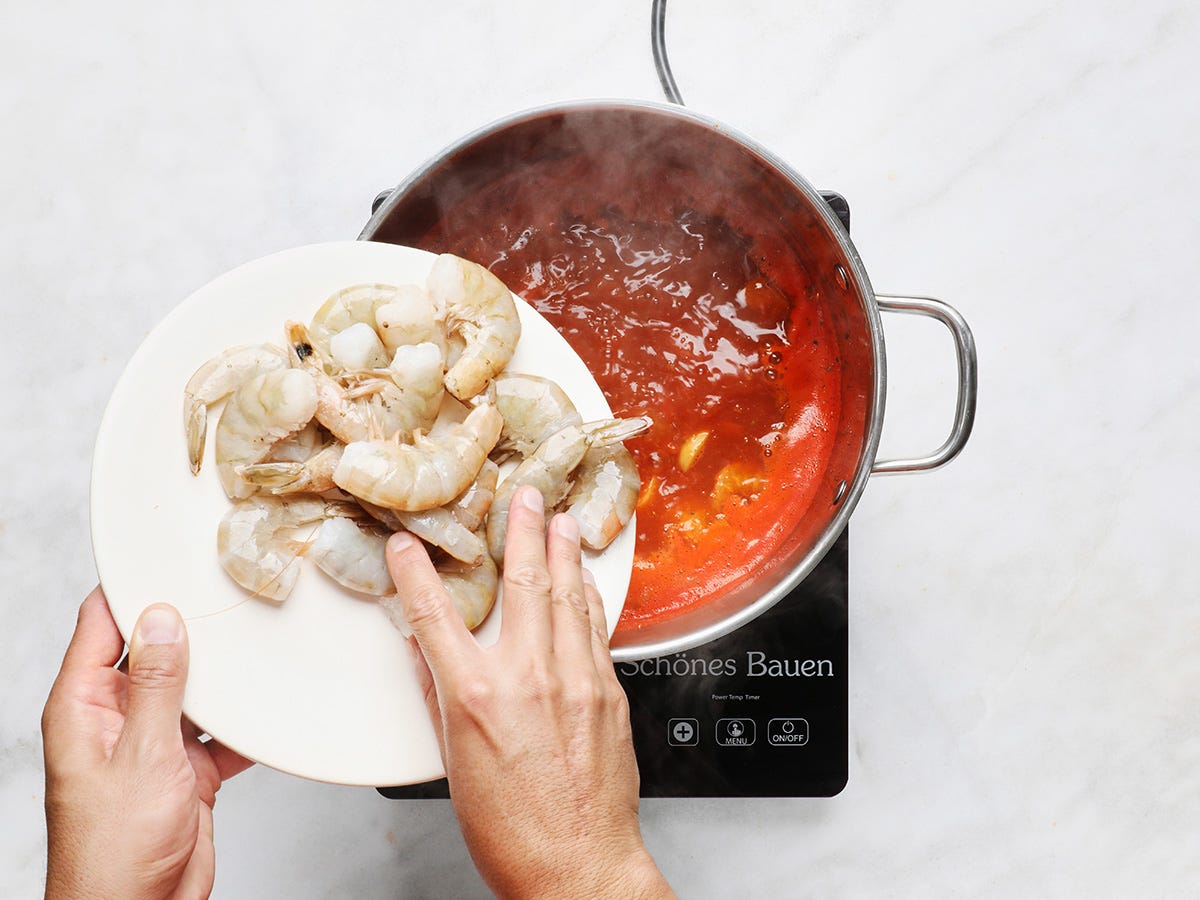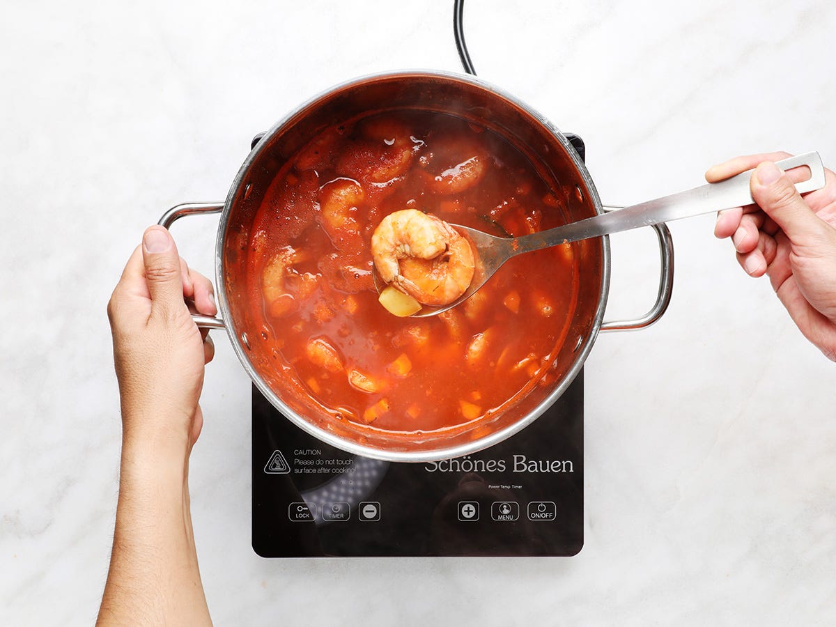 Bring to a boil, cover, and cook for 10 minutes. When you can easily pierce the carrots and potatoes with a fork, your caldo de camarón is ready!