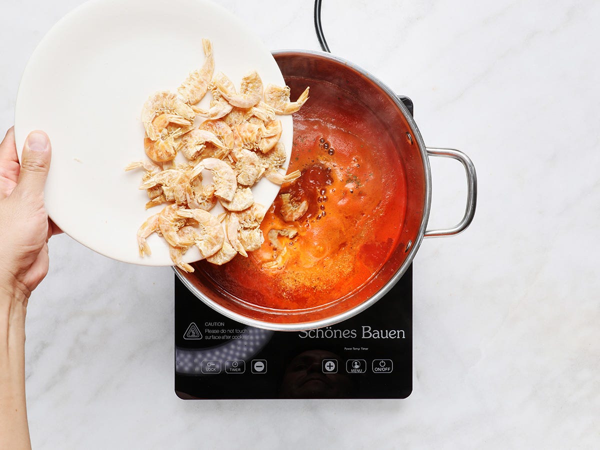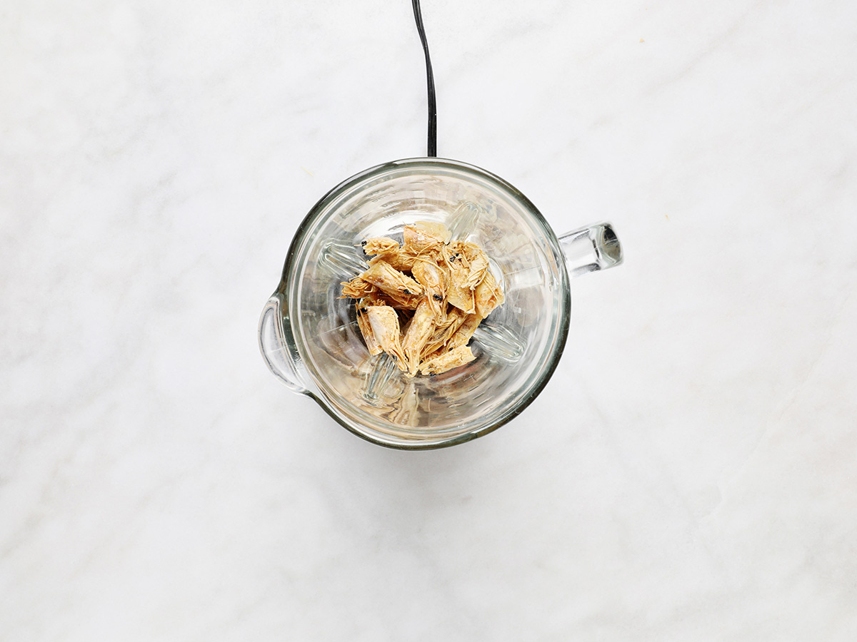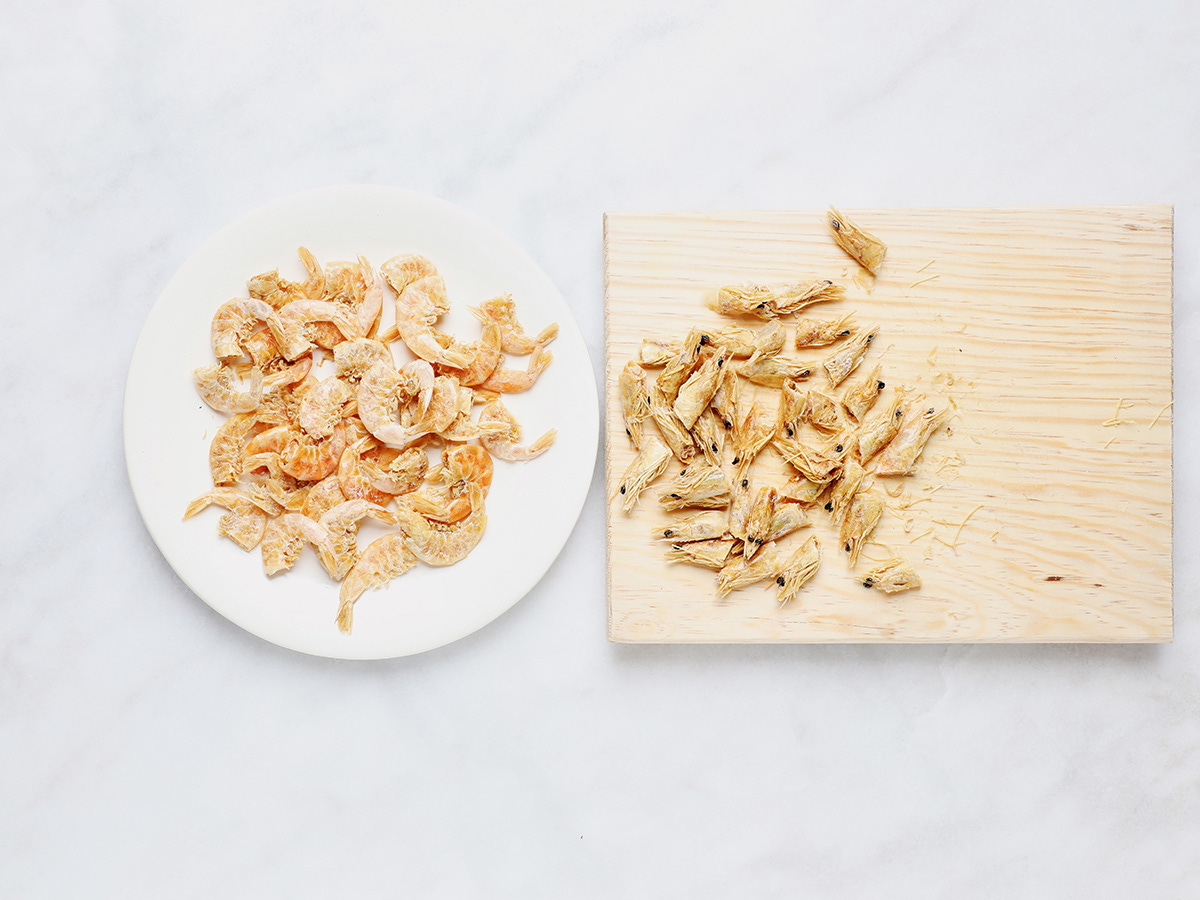 For this shrimp soup recipe, we’ll grind the heads only of the dried shrimp, and add the body to the soup in a later step. First, remove the heads of the dried shrimp by gently pulling and twisting with your fingers.