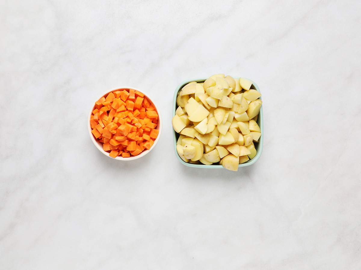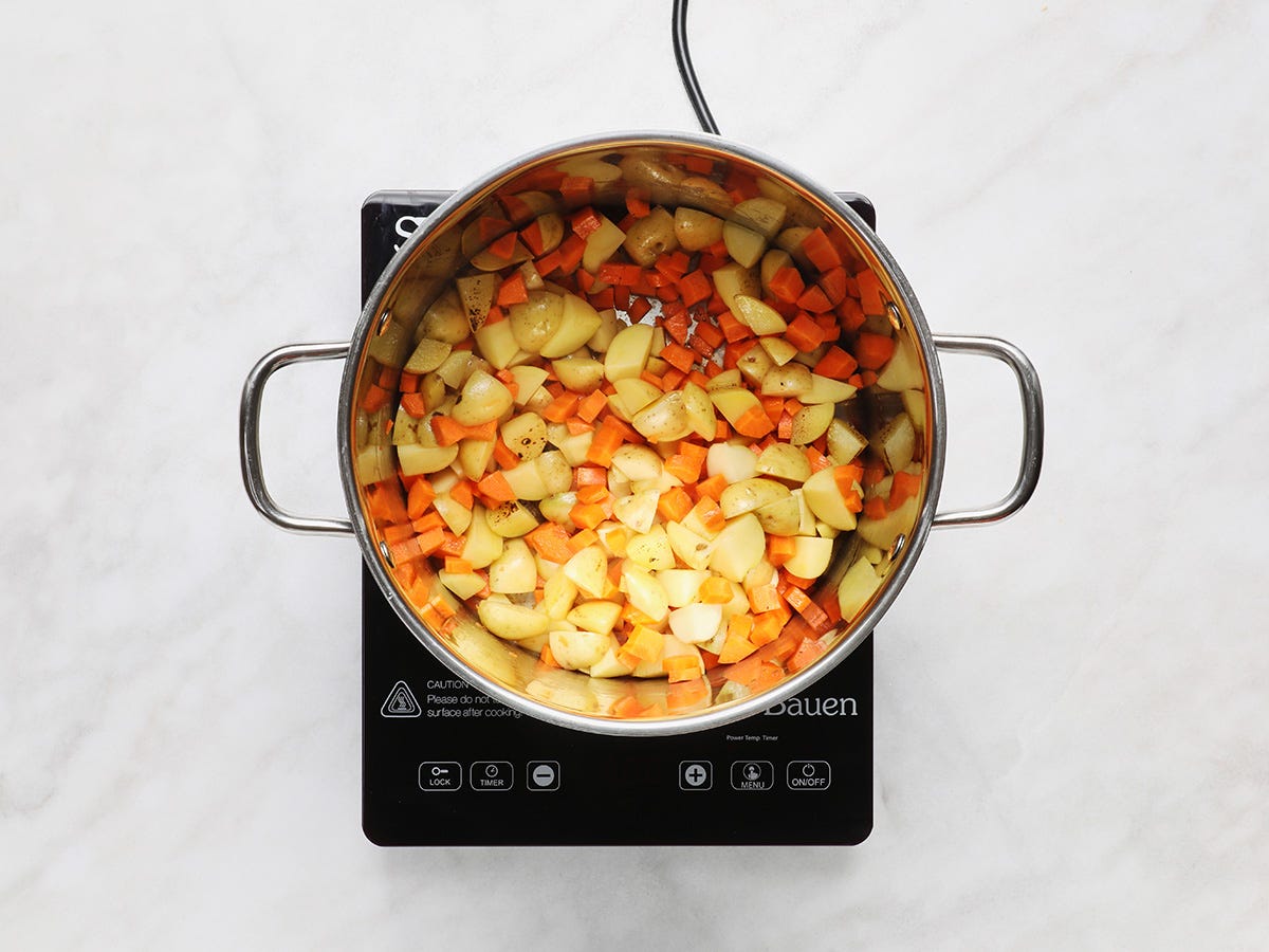 Reduce to medium-high heat and stir the potatoes constantly so they don’t stick to the bottom. Then add the diced carrots and continue to stir. Sauté vegetables for two minutes over medium-high heat.