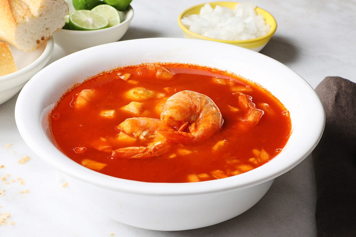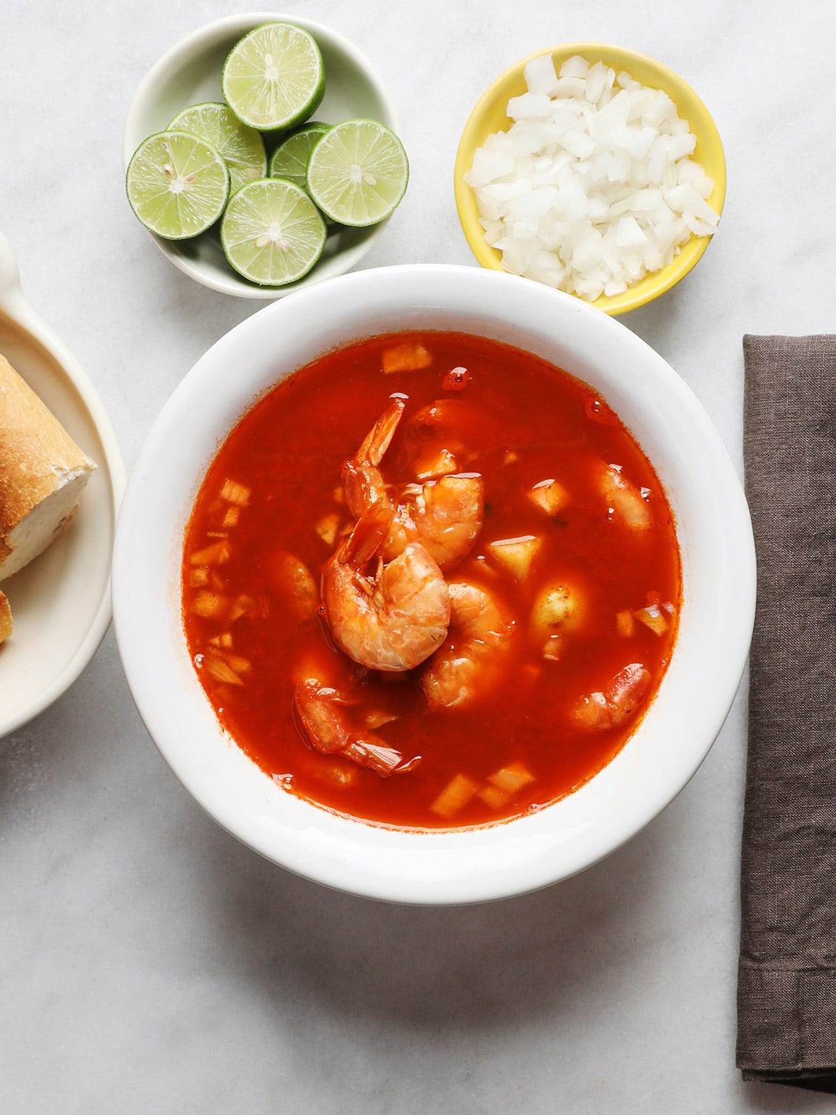 This Mexican shrimp soup brings together fresh shrimp, dried shrimp, guajillo and cascabel chilis, and tender vegetables all in one spicy bowl of comfort food.