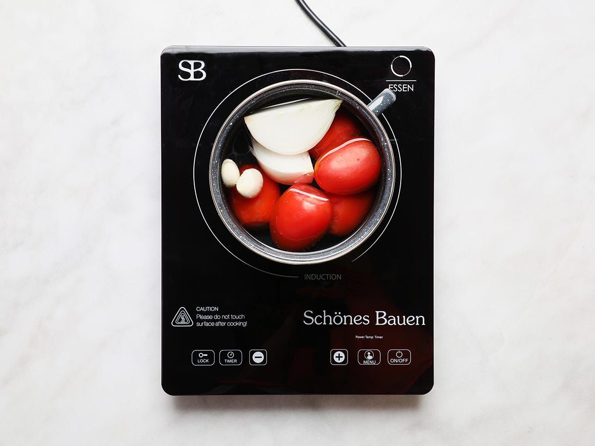 Place the onion, tomato and garlic in a pot on the stovetop with water and bring to a boil.