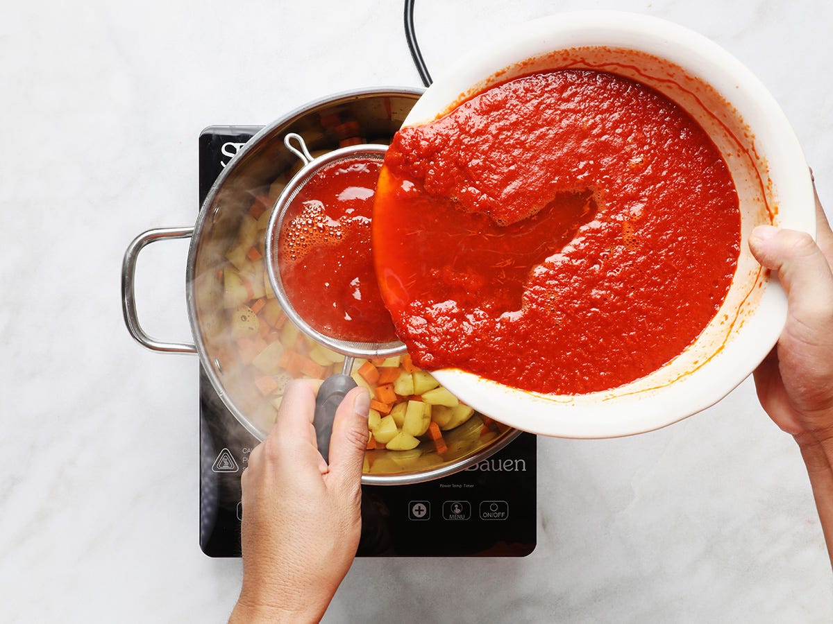 Using a fine mesh sieve, slowly strain the chili mixture into the soup pot with the veggies. You can use a spoon to stir the mixture inside the sieve to make it drain faster. Discard the contents of the sieve.