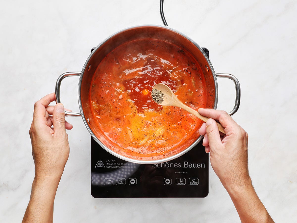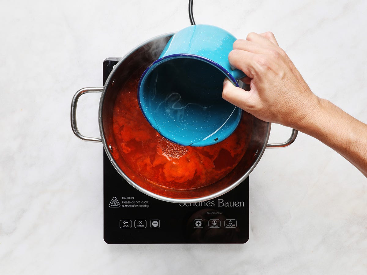 Cook the broth for about three minutes, stirring occasionally. Then add 6 cups of water to the broth and bring to a boil.