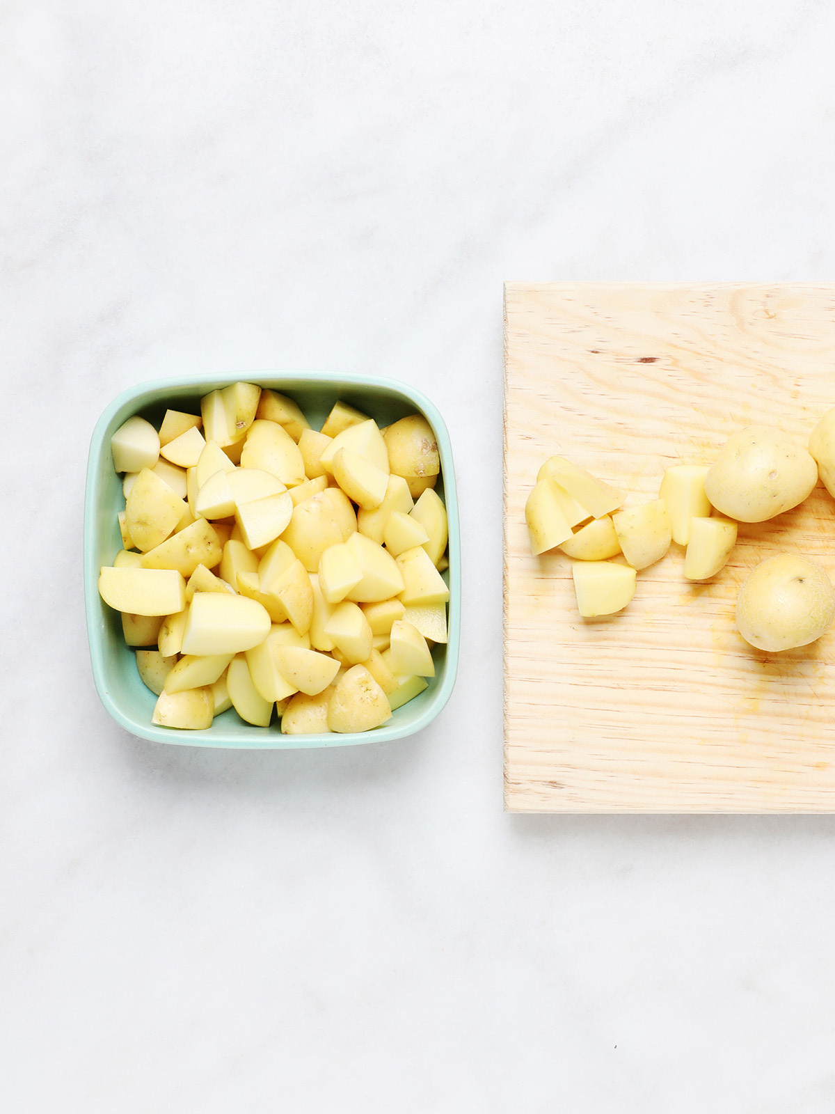 Wash and dice the Cambray potatoes into ½-inch to 1-inch pieces. Do not peel! Most of the nutrients from the potato is just under the skin, so keeping it on makes for a healthier soup and adds a little flavor and texture lift.