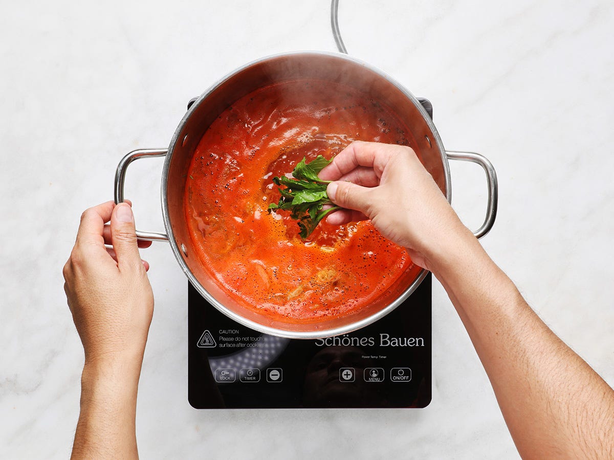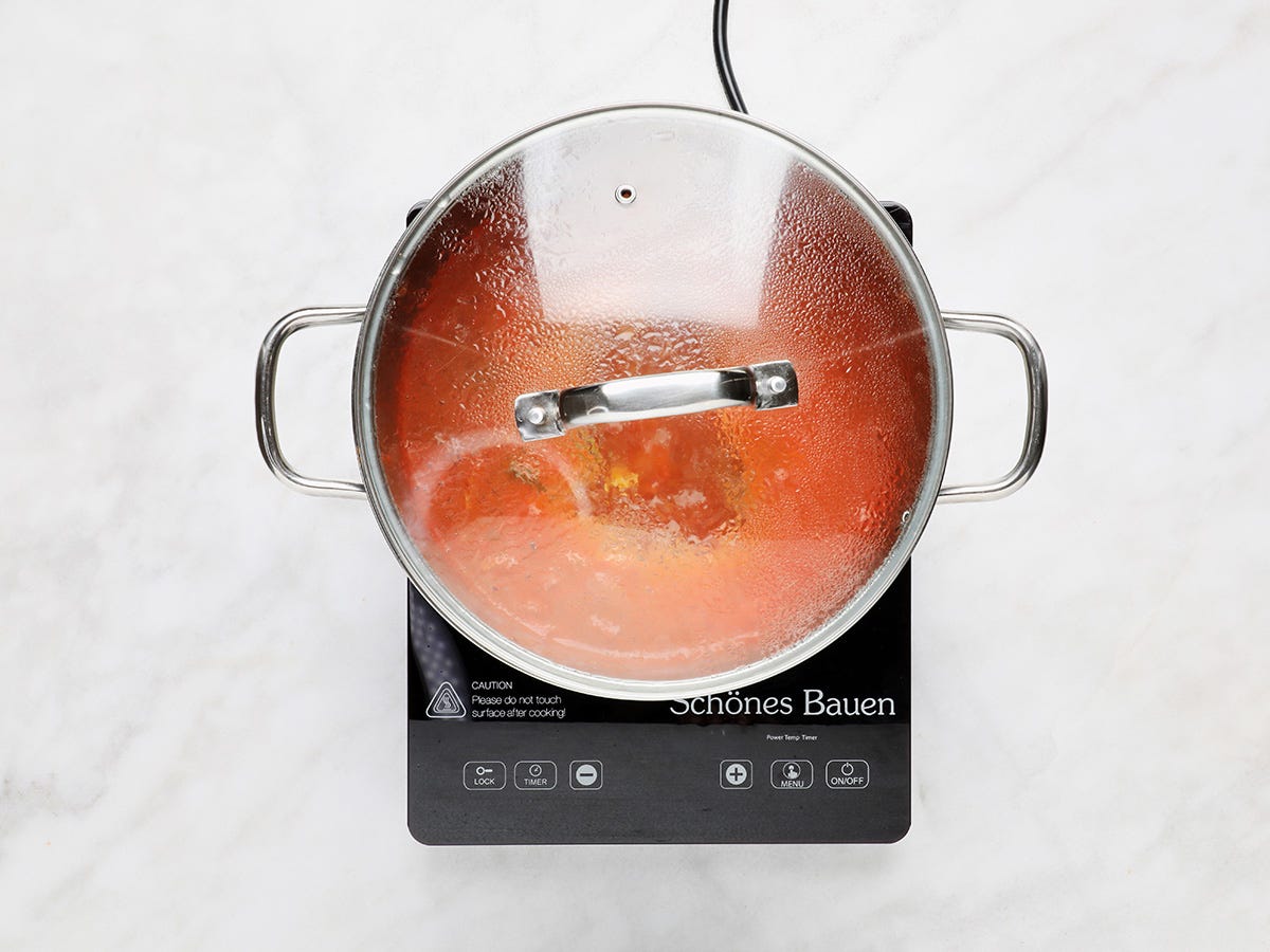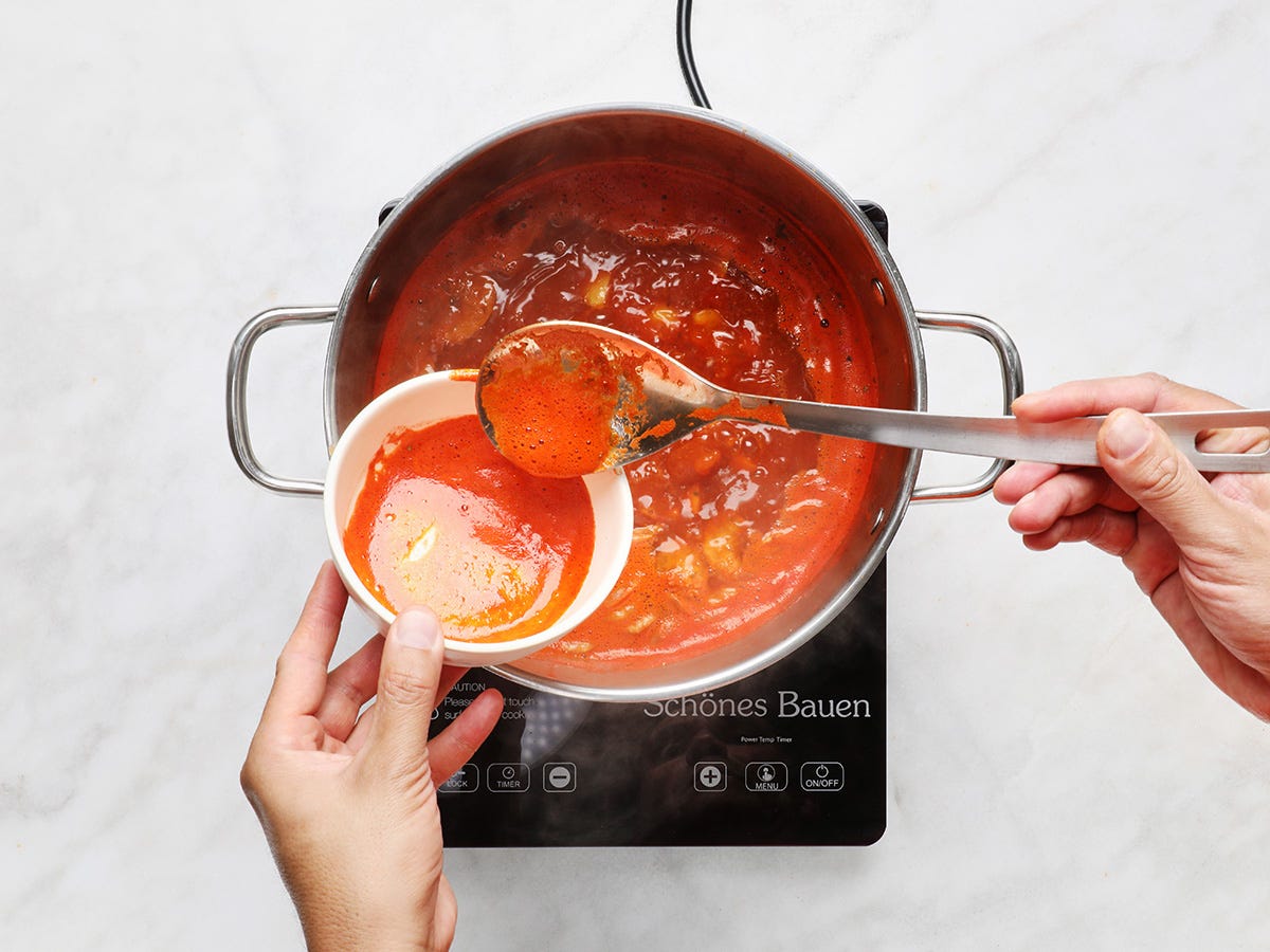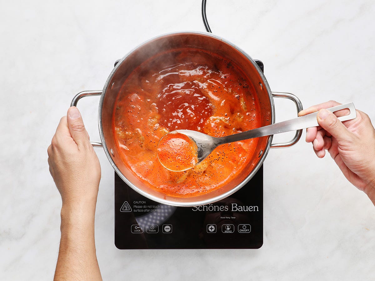 As you cook, you’ll see the skin of the tomatoes begin to peel away. Once the vegetables have changed color and softened, remove from the heat and drain the vegetables.