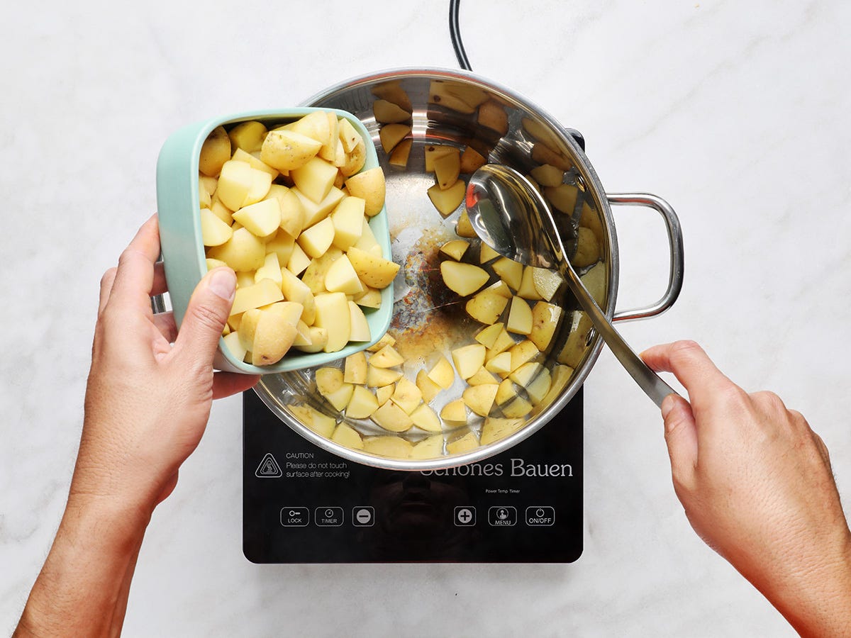 Heat the cooking oil in a soup pot over high heat. Then add the potatoes to the pot.