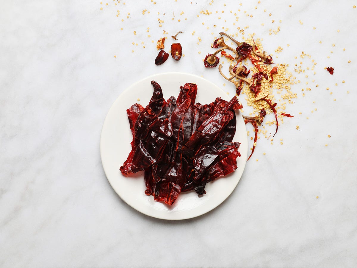 To create a flavorful base for our soup, we’ll need to soak the guajillo and cascabel chilis. While ground, dried chilis make powerful spices, soaking chilis takes off some of the heat to provide a smoother-tasting broth.