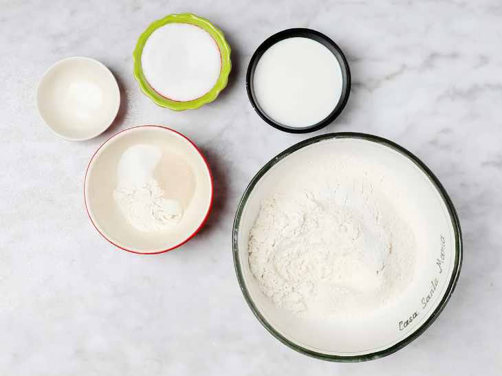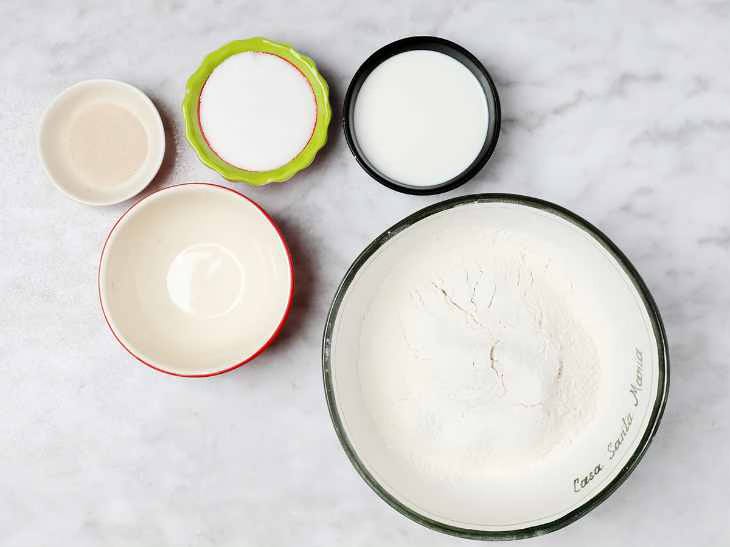 In a small bowl, add 4 tbsp. flour, 2 tbsp. sugar, and the dry yeast. Add 1 to 2 ozs. of warm milk. This is just enough to make a thin, homogeneous paste.
