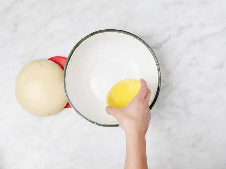 Add 1 tbsp. of oil to a large mixing bowl. Coat the bottom and sides of the bowl with the oil. Add the ball of dough to your mixing bowl. Press the dough down and coat with a bit more oil. Cover the bowl with a kitchen towel.