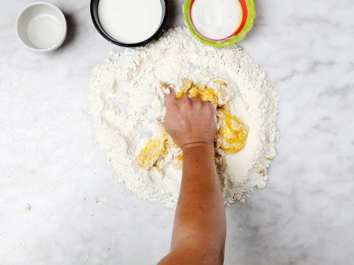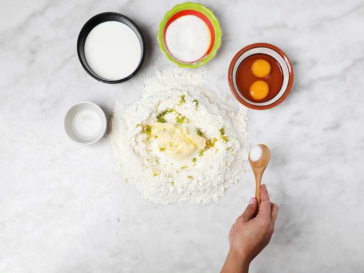 On your work table, pour out the flour and make an indentation in the middle. In the indentation, add the butter, half the sugar, and the grated orange peel. Sprinkle the salt around the outside ring of flour.