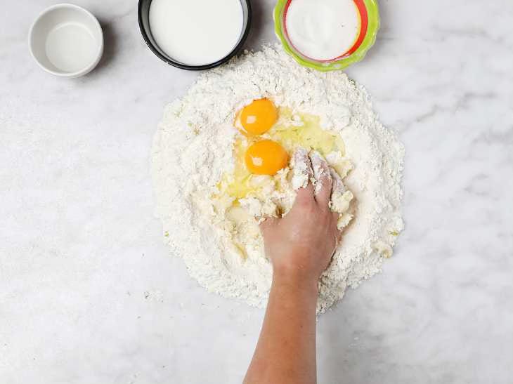 Then add the eggs, continuing to mix with your hands.