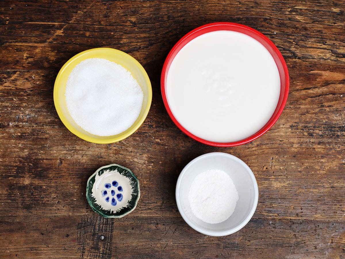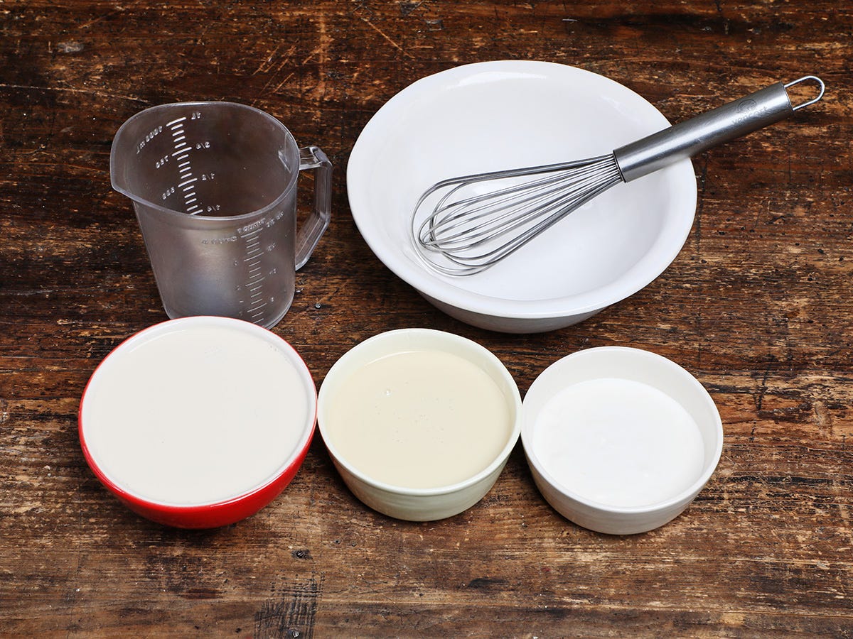 Gather your condensed milk, evaporated milk and light cream (or table cream) in separate bowls, as well as a large bowl, measuring cup and wire whisk.