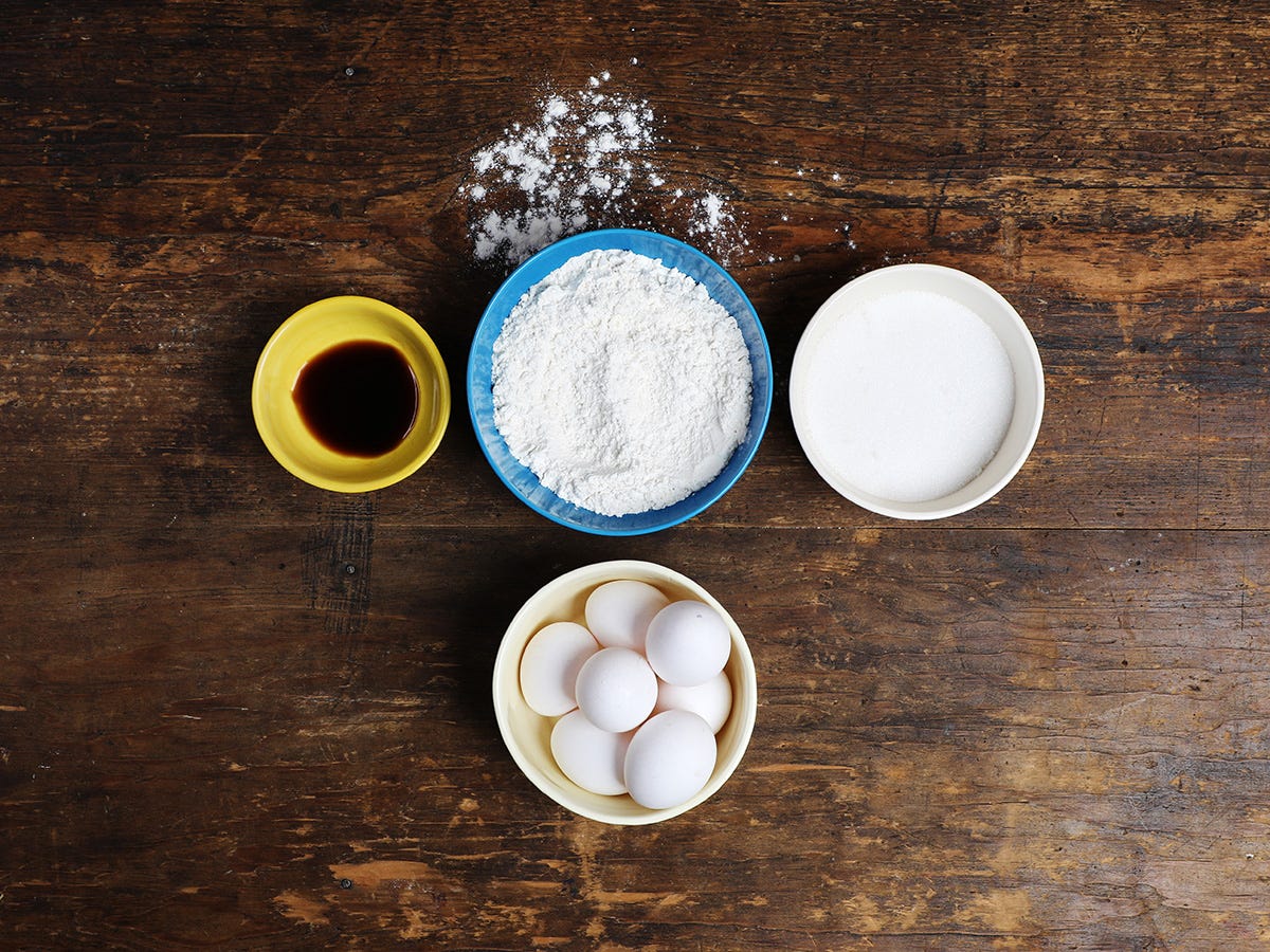 Gather your three bowls: one with flour, one with egg white mixture, and the other with the egg yolk mixture. Using the egg yolk mixture as your main mixing bowl, you’ll add flour and then egg white mixture little by little, alternating as you fold into the batter.