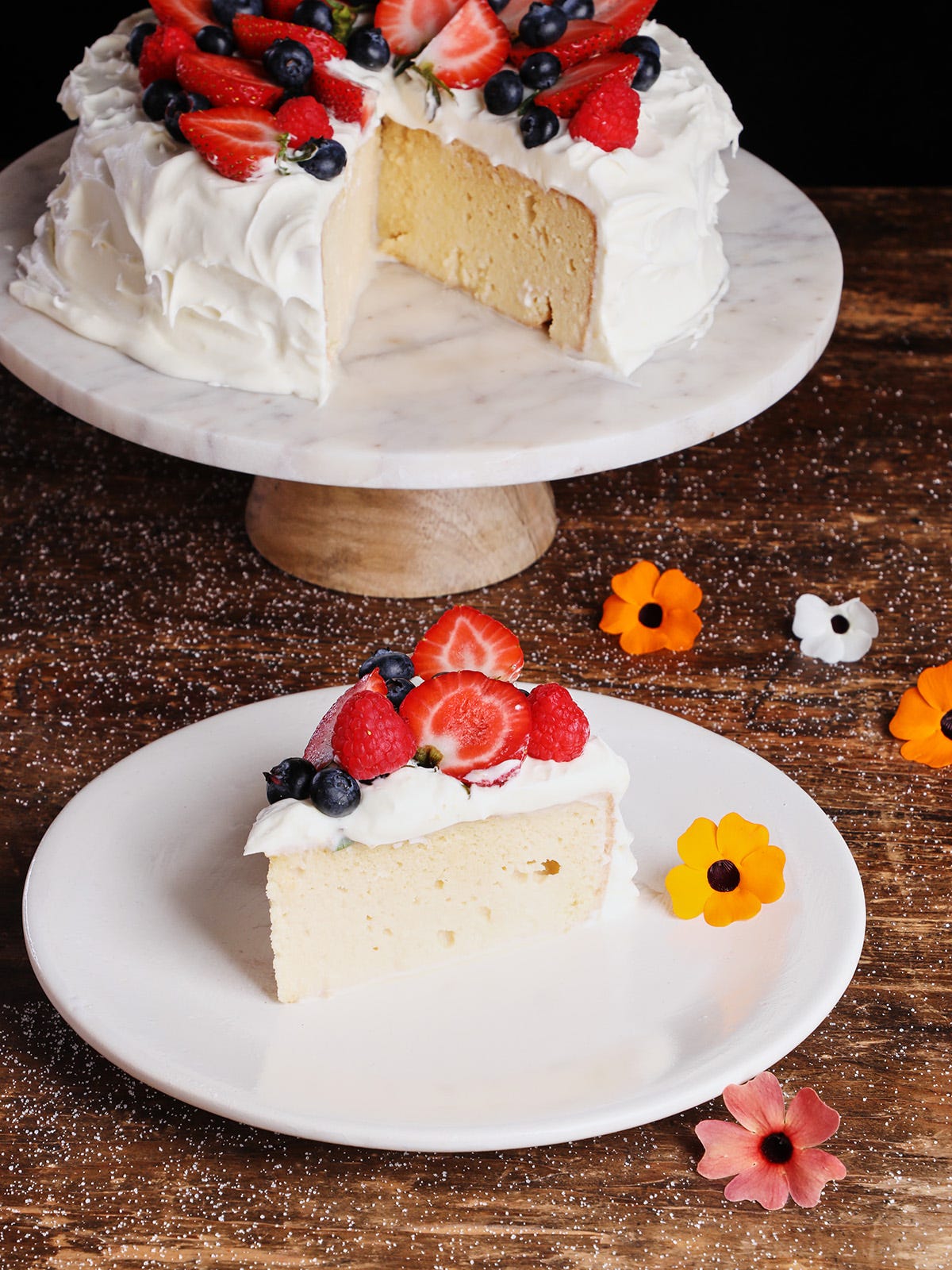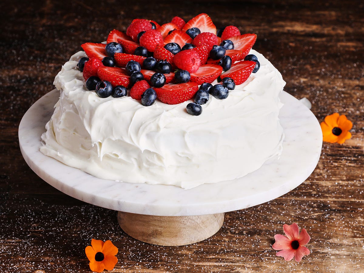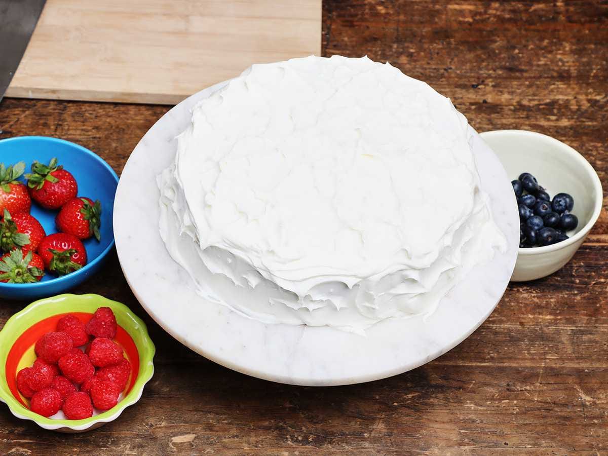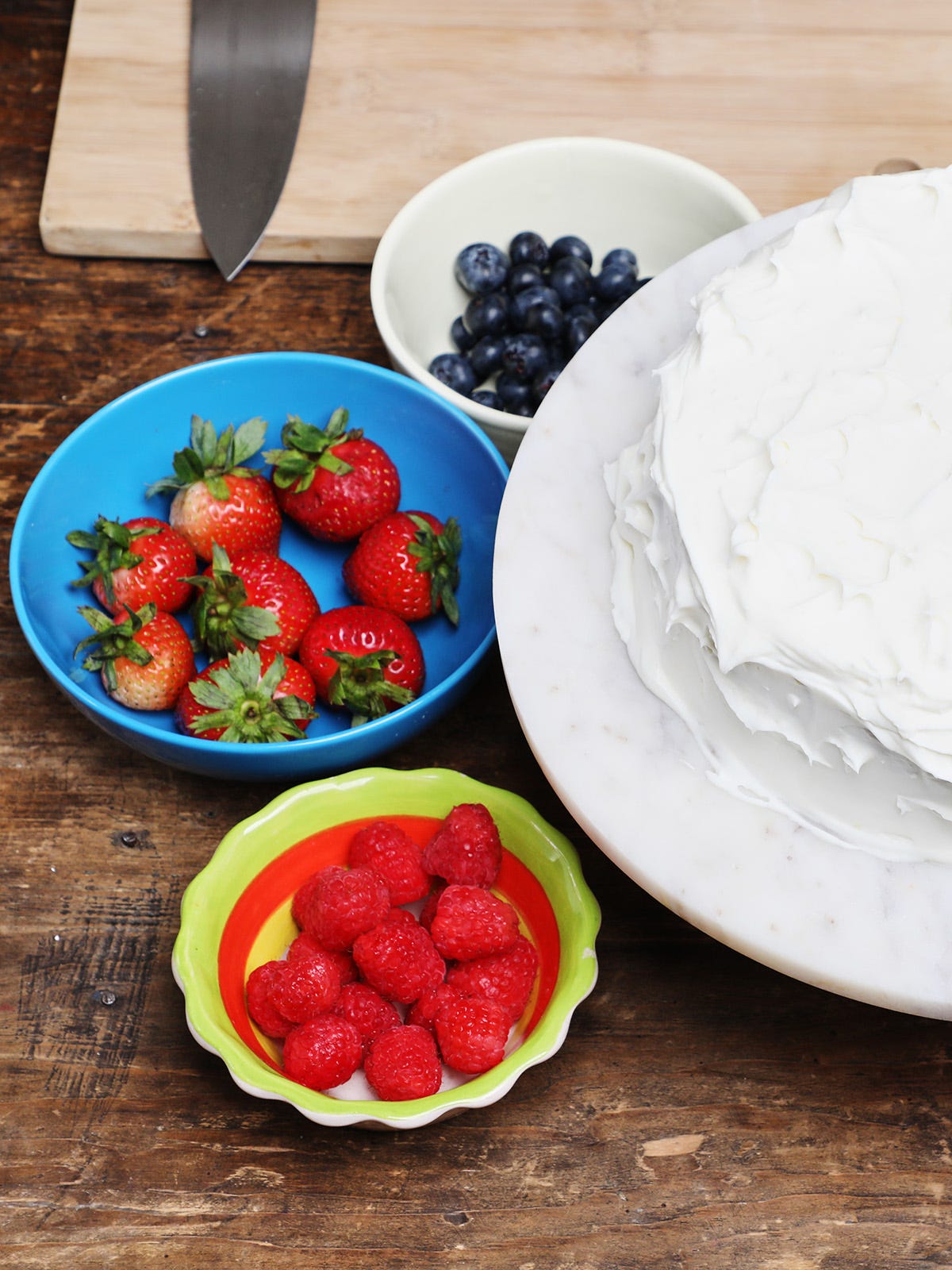 If you’re using strawberries, slice them in half and make a ring around the center of the cake, pressing the tops of the berries gently into the cake, cut side up. Fill in the ring with more strawberries, then sprinkle with raspberries and blueberries.