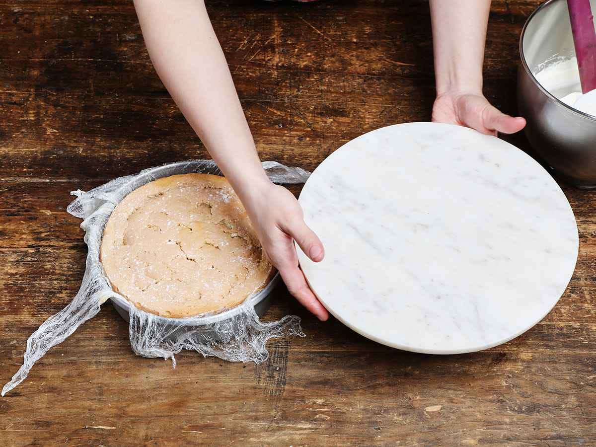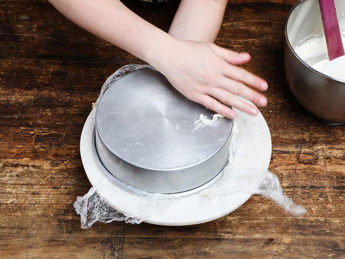 Line the cooled cake pan with plastic wrap. You’re going to place the cake back in the pan and then cover, so be sure you leave enough wrap on the sides to do so.